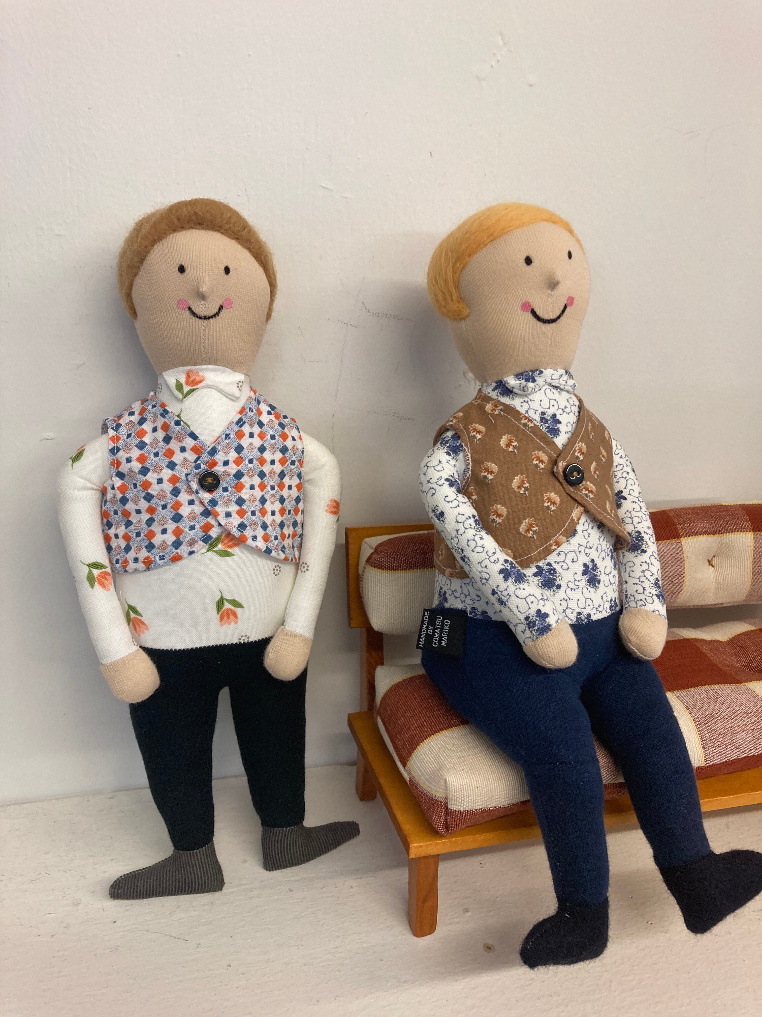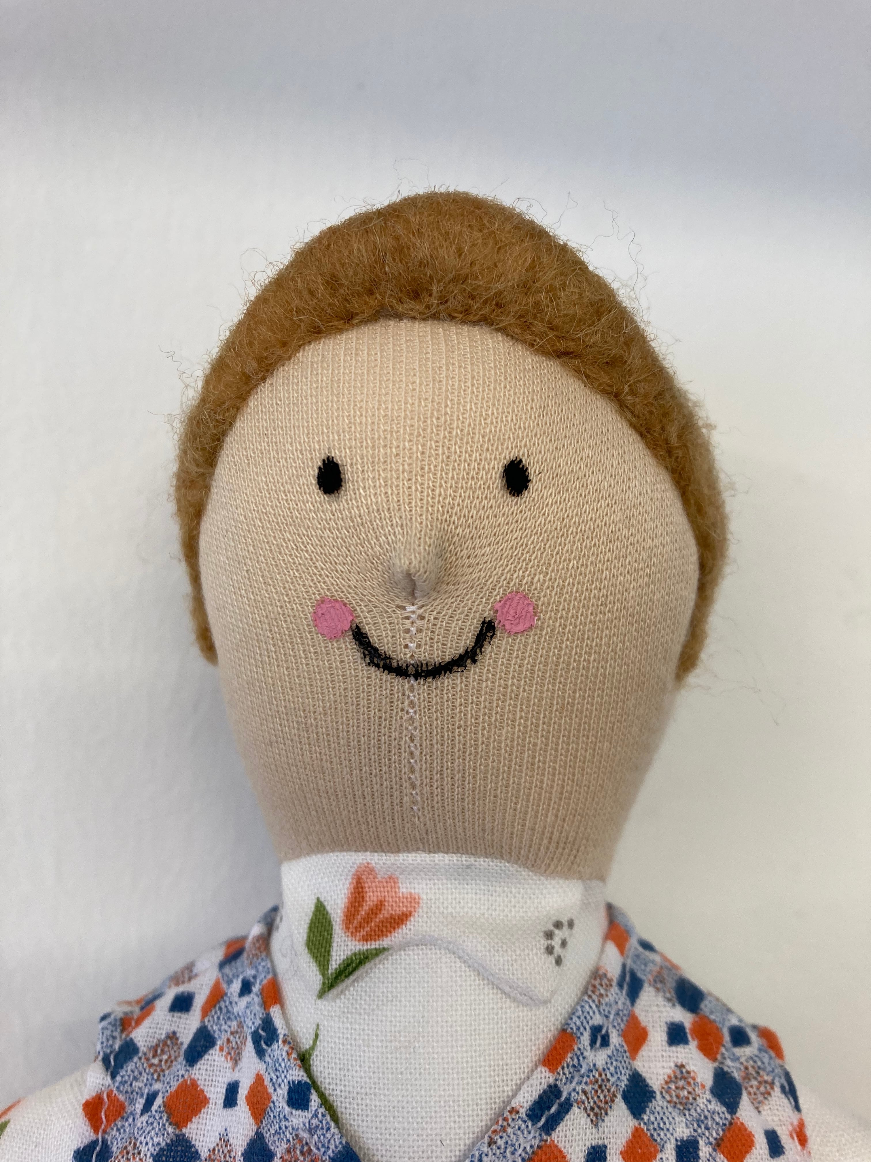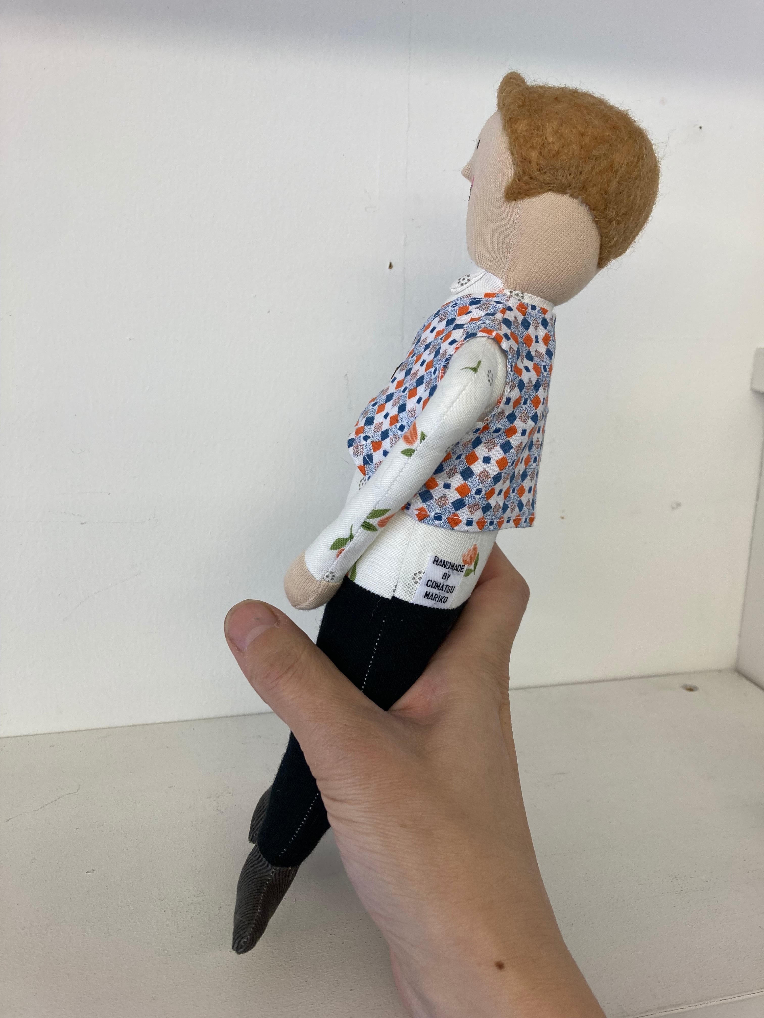 johnくん(ジョンくん) 立ち姿 素材:コットンや麻の生地・アクリルわた・羊毛フェルト・アクリル絵の具 身長:髪型も含めて28cmほど 肌の色:ベージュ色 髪の色:カフェオレ色 自立して立つ事は出来ませんので、本棚や壁などにに立てかけて飾って下さい。 お洋服にアメリカやヨーロッパのヴィンテージ布を使用しています。 着せ替えはできません。 hand made by comatsumariko