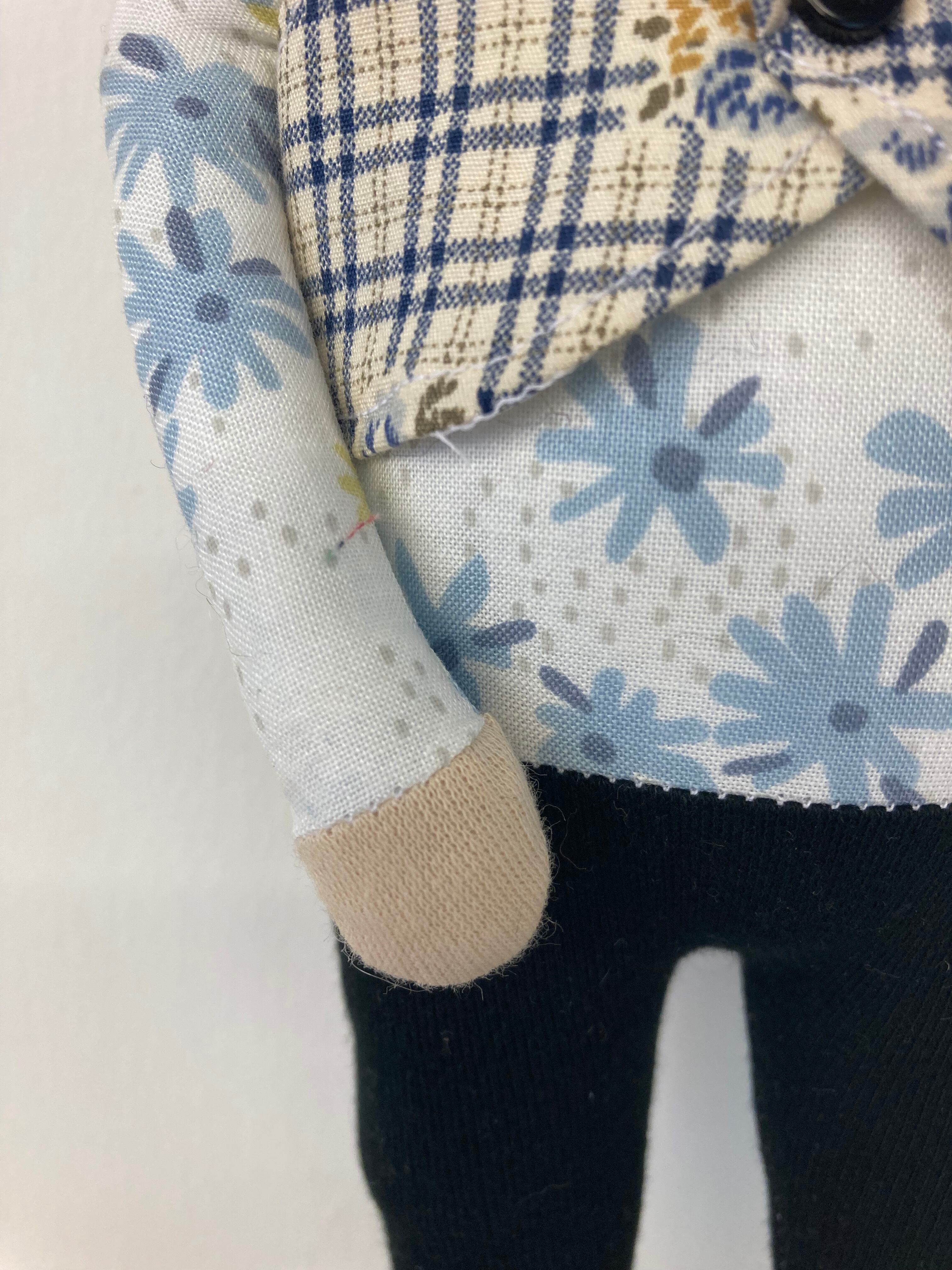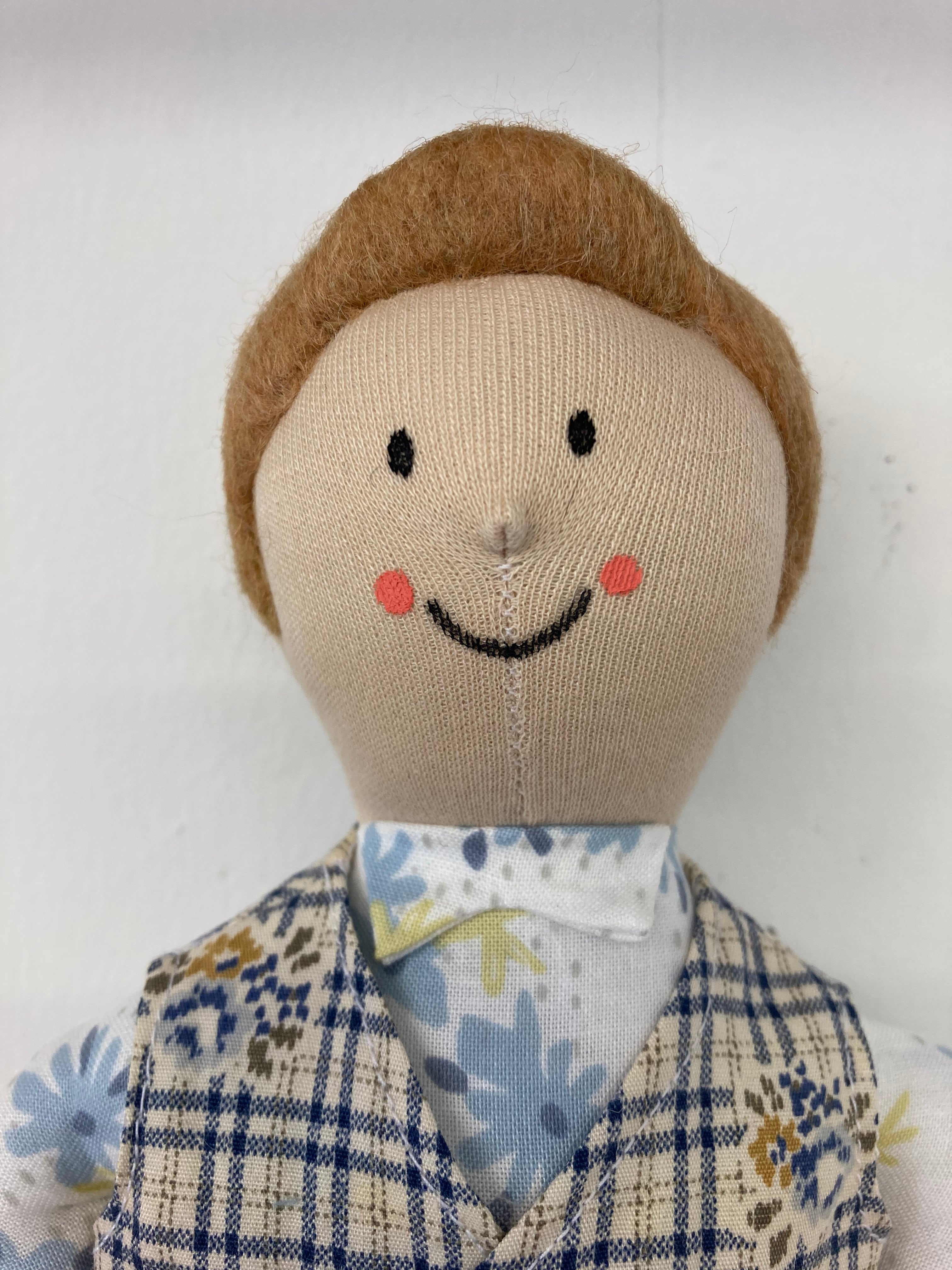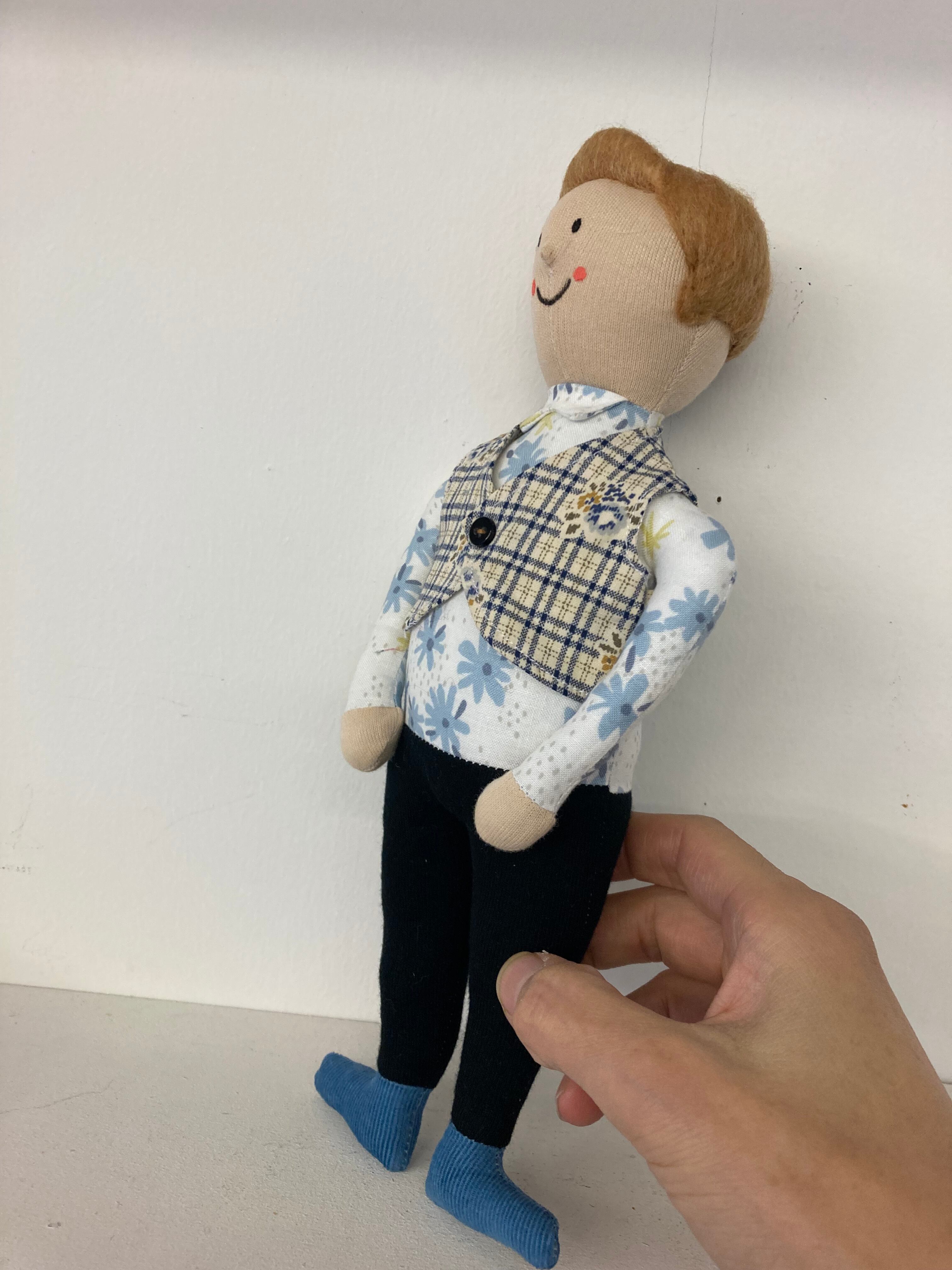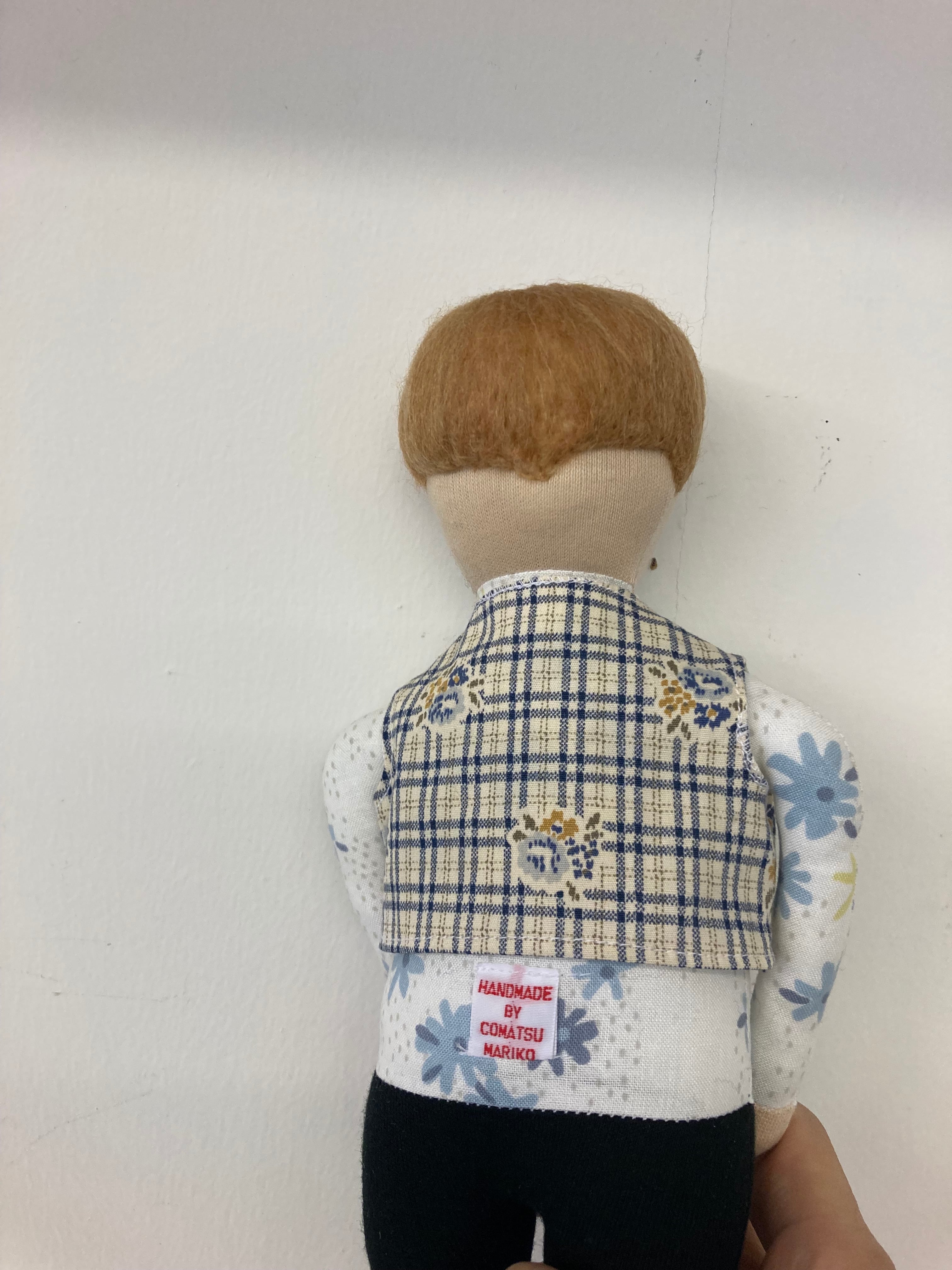 johnくん(ジョンくん) 立ち姿 素材:コットンや麻の生地・アクリルわた・羊毛フェルト・アクリル絵の具 身長:髪型も含めて28cmほど 肌の色:ベージュ色 髪の色:カフェオレ色 自立して立つ事は出来ませんので、本棚や壁などにに立てかけて飾って下さい。 お洋服にアメリカやヨーロッパのヴィンテージ布を使用しています。 着せ替えはできません。 hand made by comatsumariko