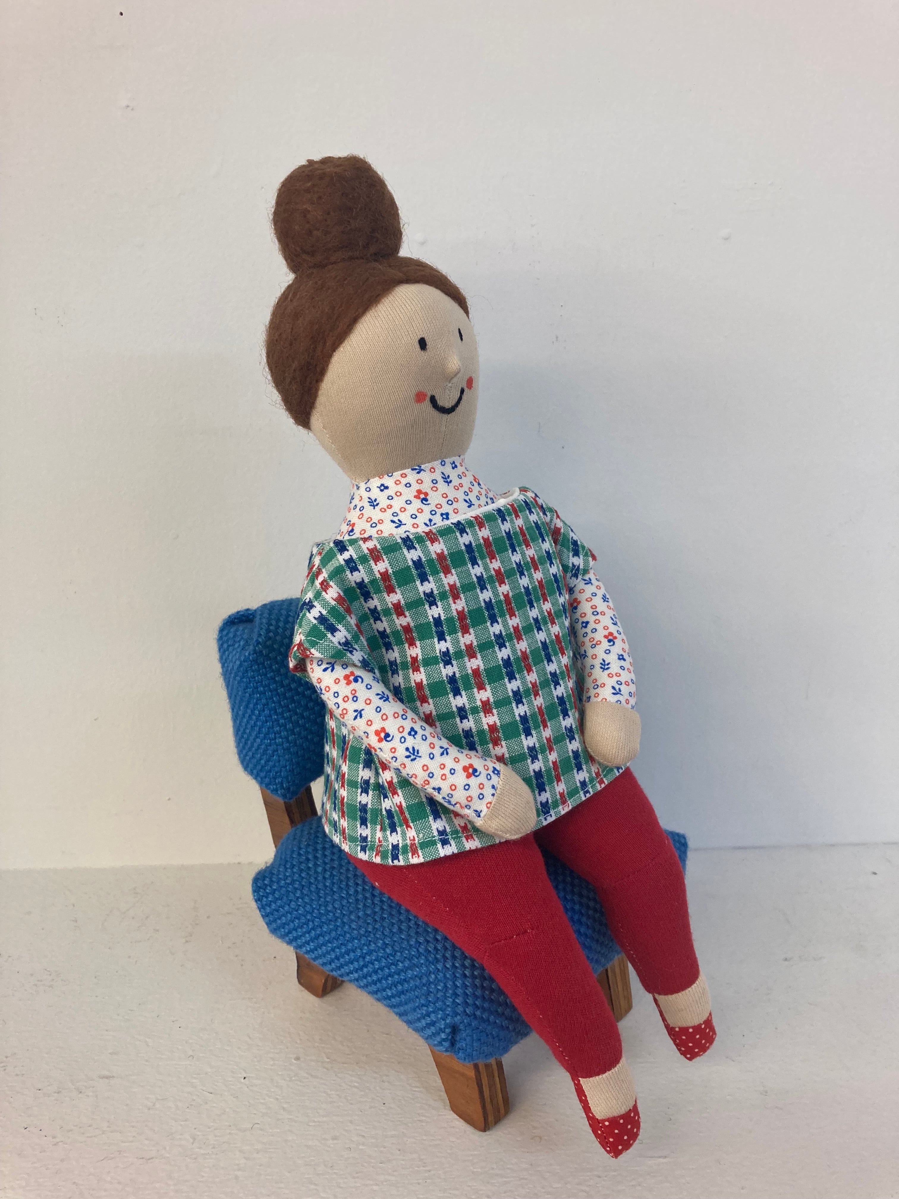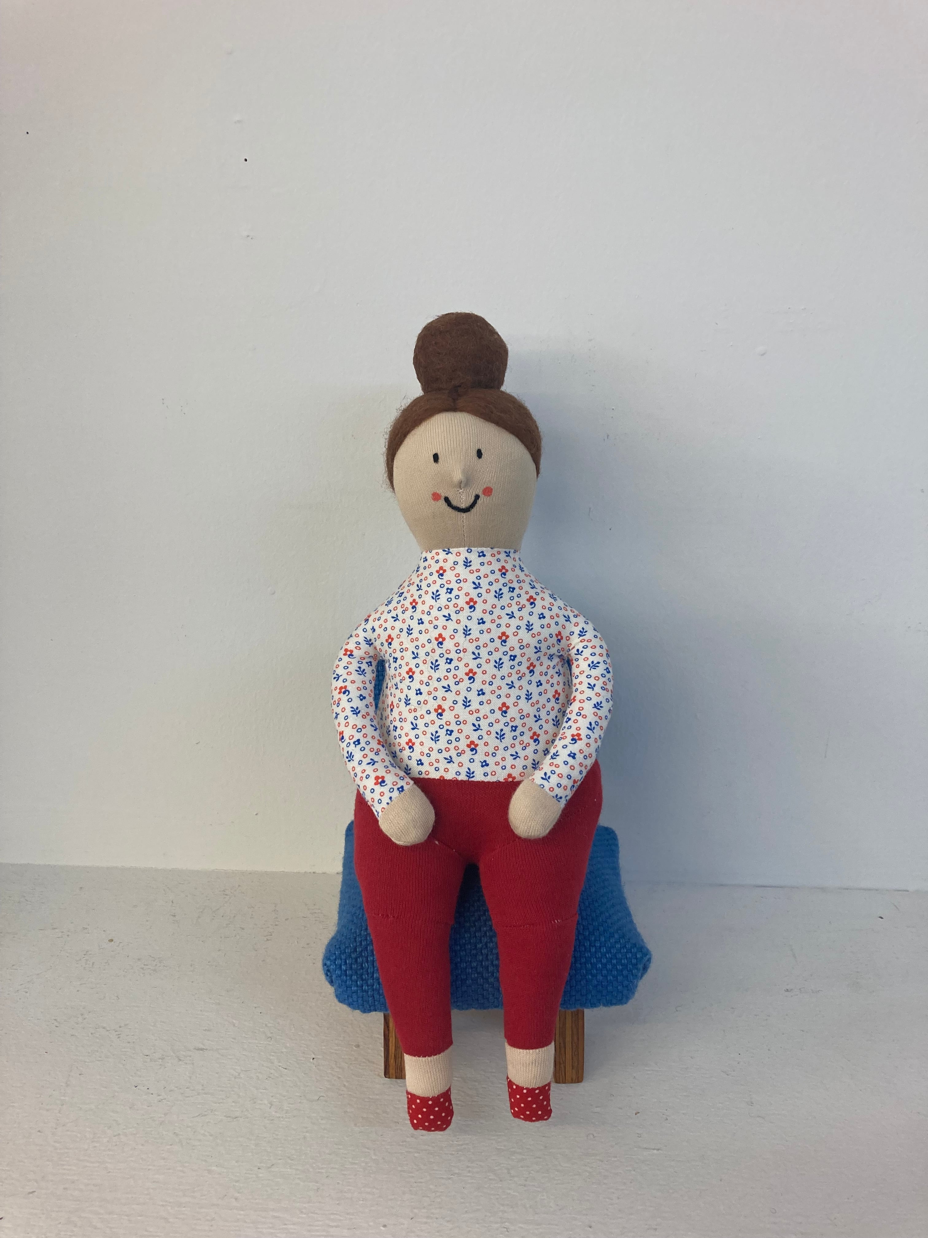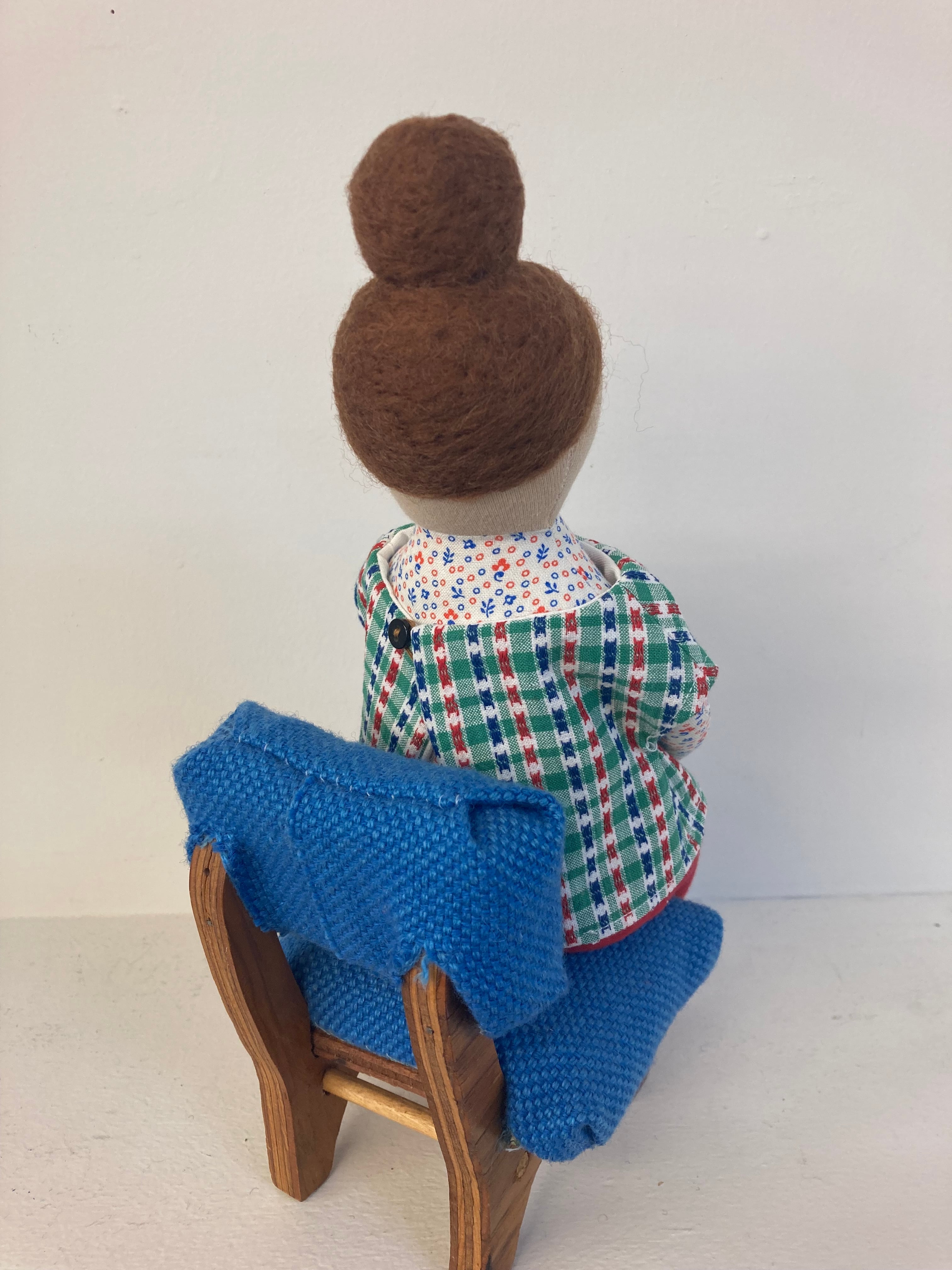 sokkoちゃん(ソッコちゃん) 座り姿 素材:コットンや麻の生地・アクリルわた・羊毛フェルト・ペレット・アクリル絵の具 身長:髪型も含めて27cmほど 肌の色:ベージュ 髪の色:焦茶色 チュニックのみ着せ替えができます。 棚や椅子・テーブルの上で自立して座ります。 (座面内部に重しとしてペレットを使用しています) ※椅子は付属しません hand made by comatsumariko