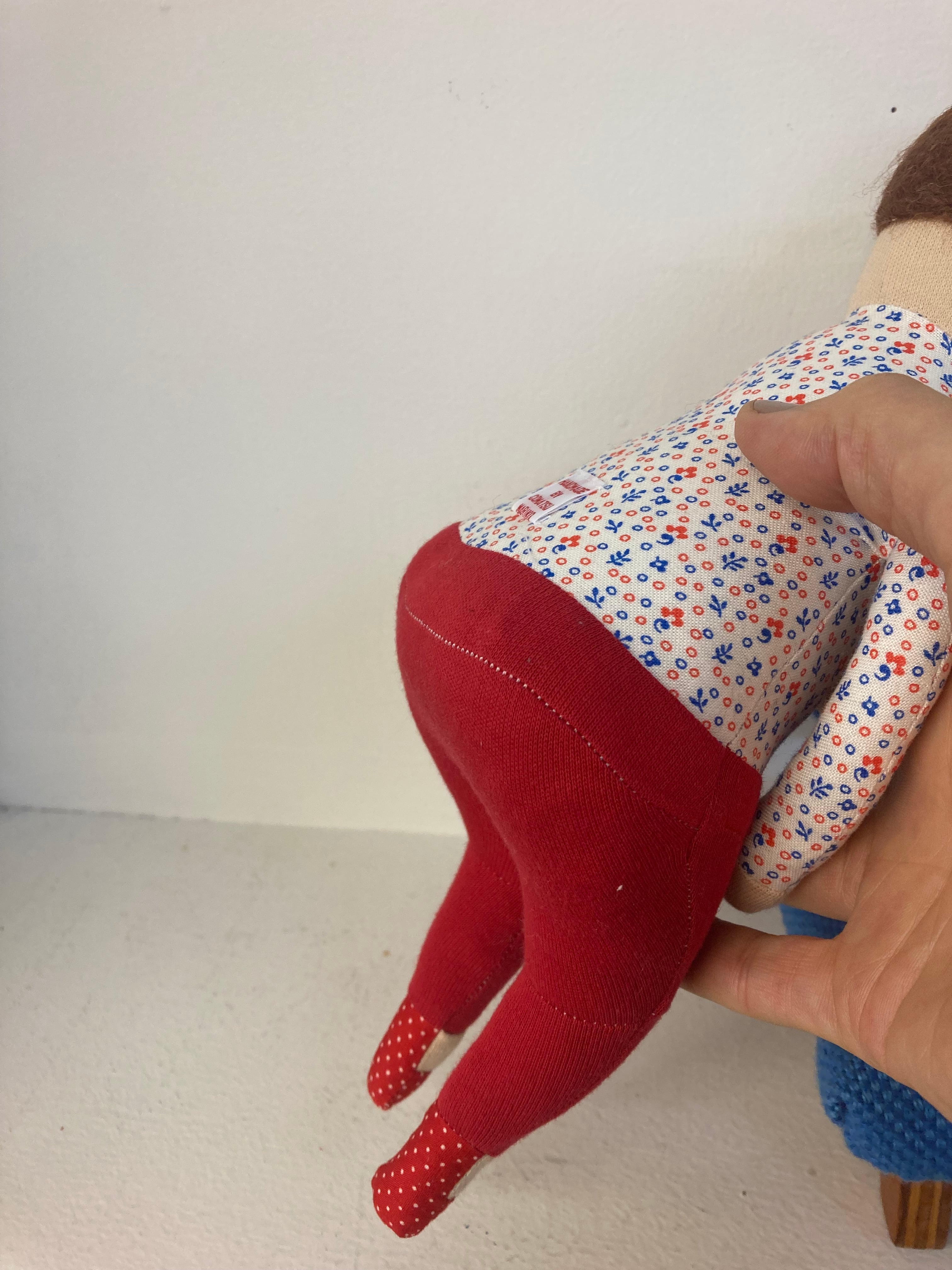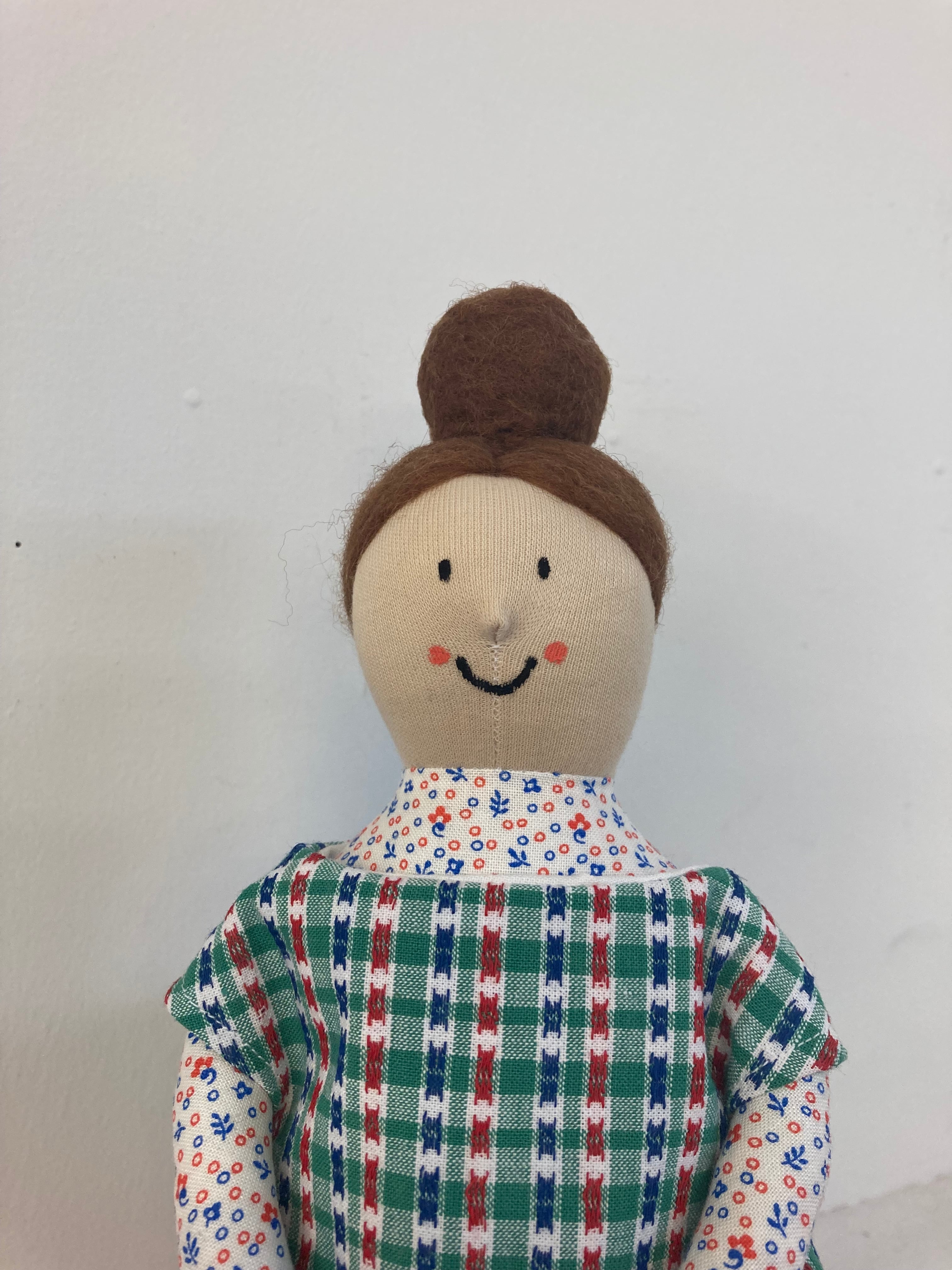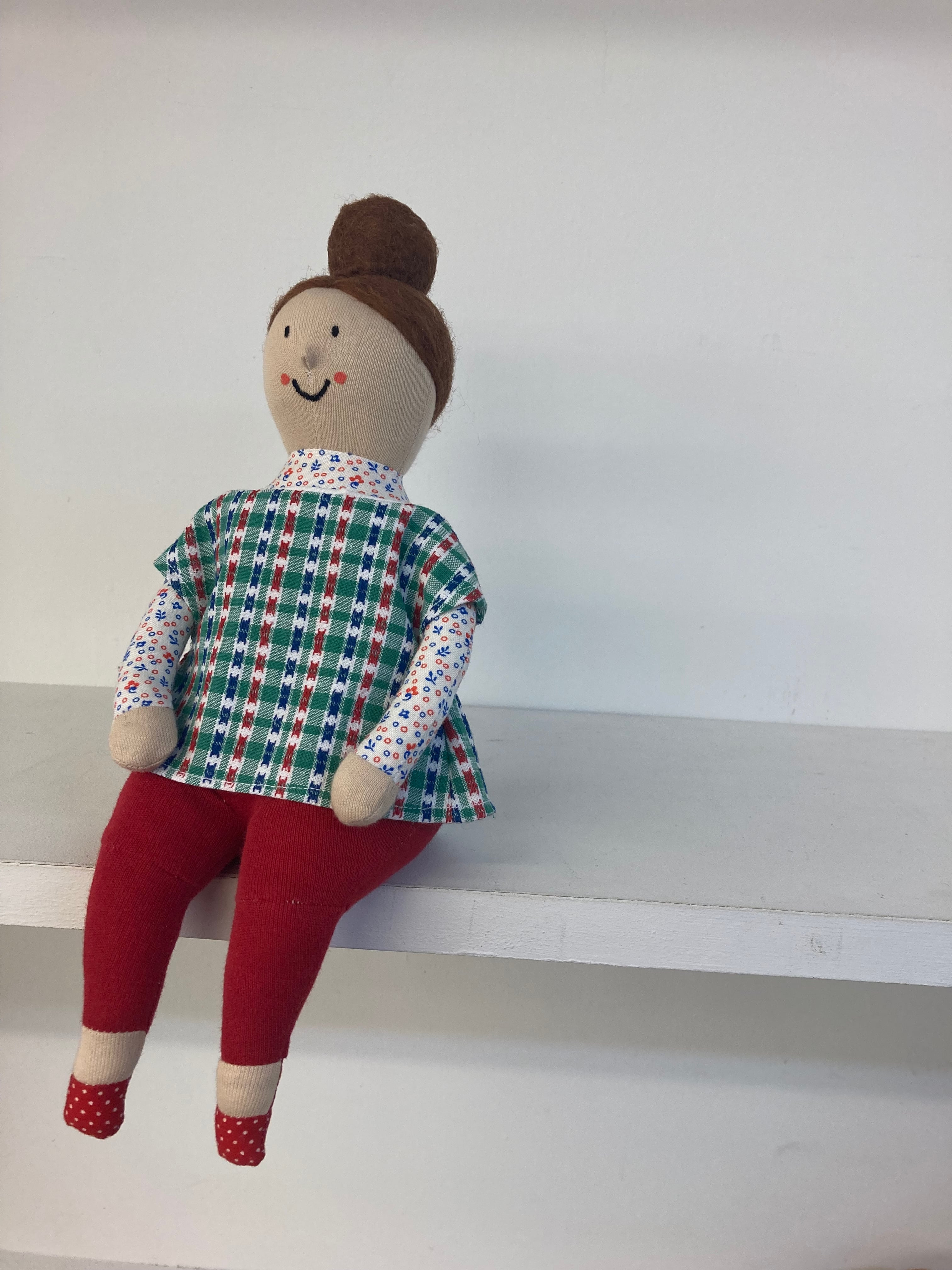 sokkoちゃん(ソッコちゃん) 座り姿 素材:コットンや麻の生地・アクリルわた・羊毛フェルト・ペレット・アクリル絵の具 身長:髪型も含めて27cmほど 肌の色:ベージュ 髪の色:焦茶色 チュニックのみ着せ替えができます。 棚や椅子・テーブルの上で自立して座ります。 (座面内部に重しとしてペレットを使用しています) ※椅子は付属しません hand made by comatsumariko