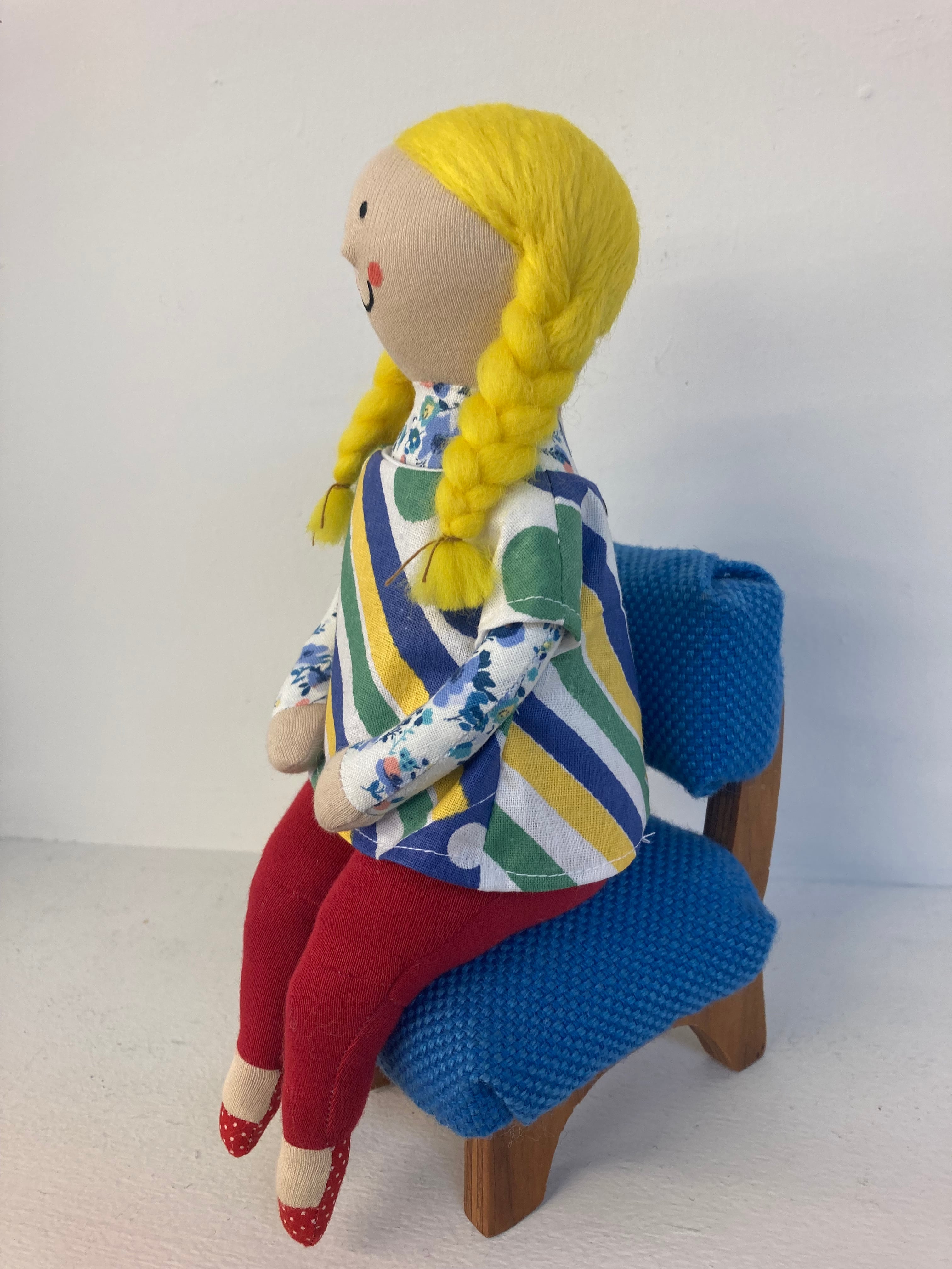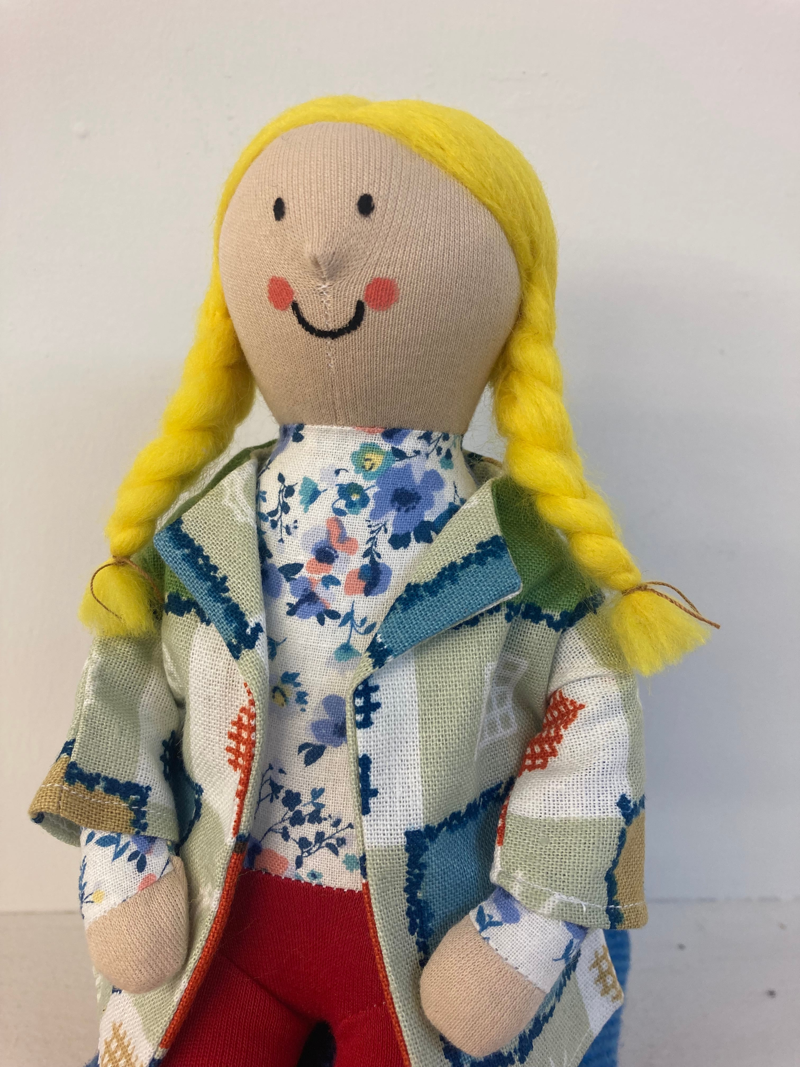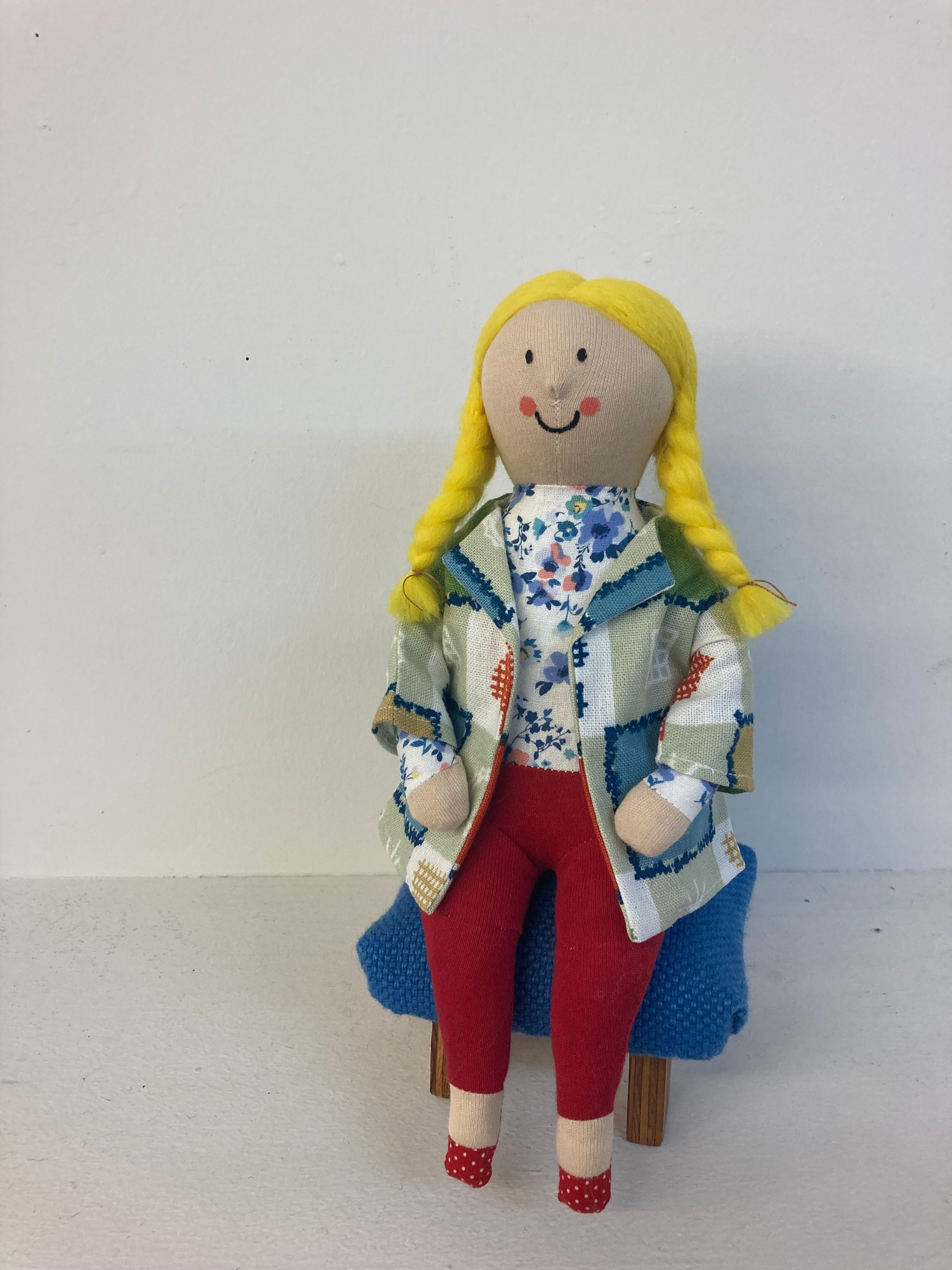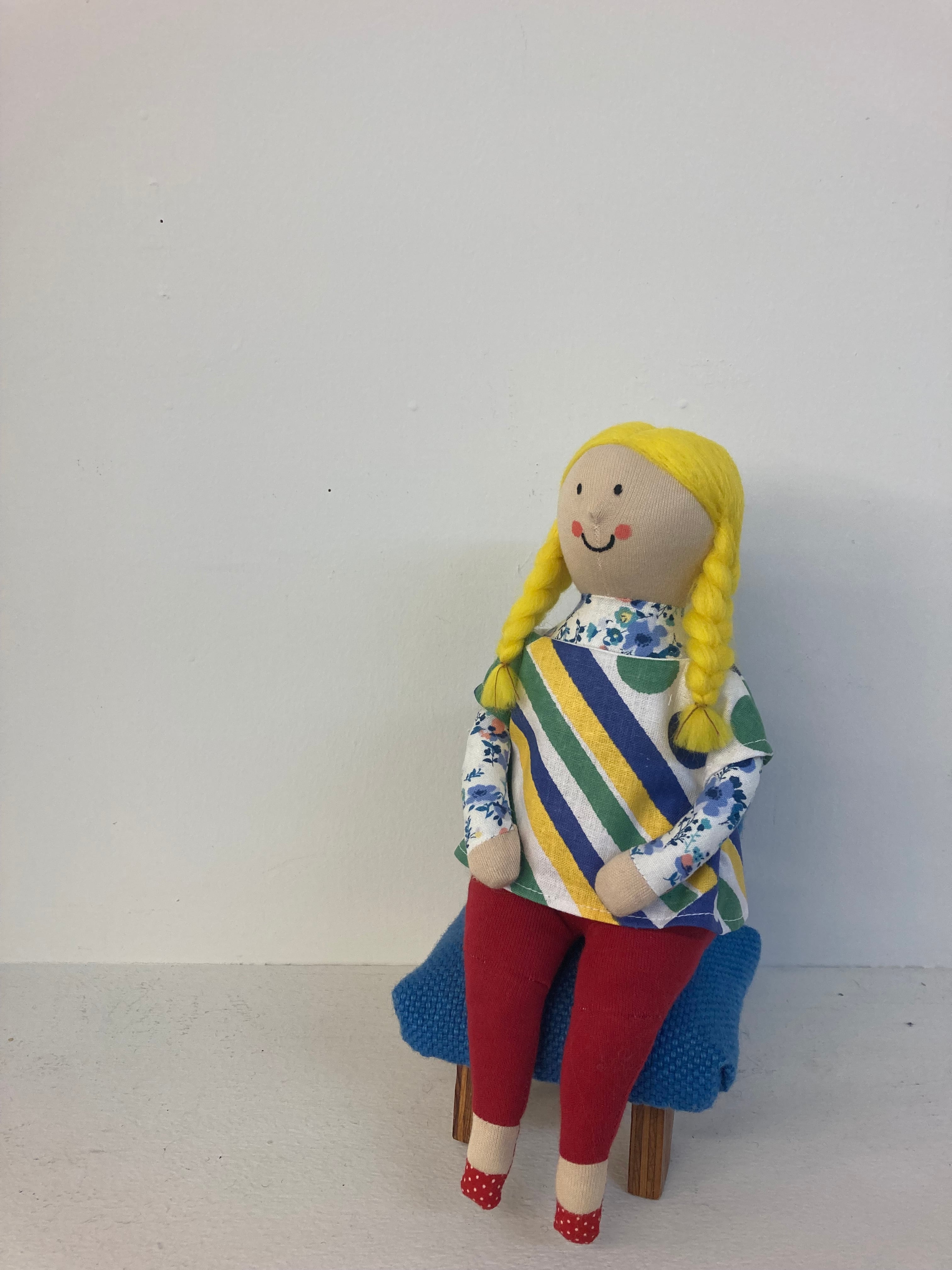 sokkoちゃん(ソッコちゃん) 座り姿 素材:コットンや麻の生地・アクリルわた・羊毛フェルト・ペレット・アクリル絵の具 身長:髪型も含めて27cmほど 肌の色:ベージュ 髪の色:黄色 チュニックのみ着せ替えができます。 棚や椅子・テーブルの上で自立して座ります。 (座面内部に重しとしてペレットを使用しています) ※椅子は付属しません ※着せ替え用のドレスは付属しません。 hand made by comatsumariko