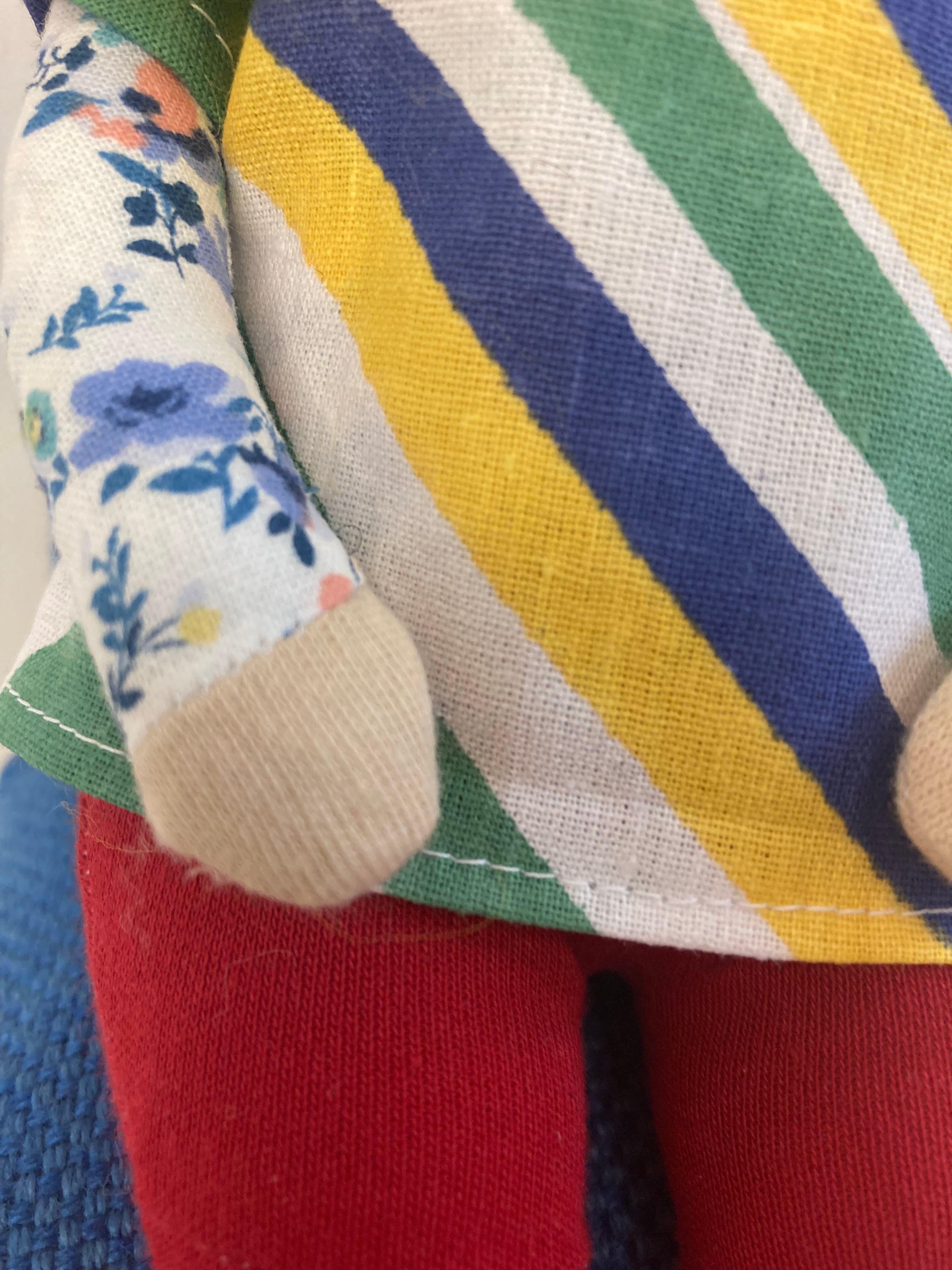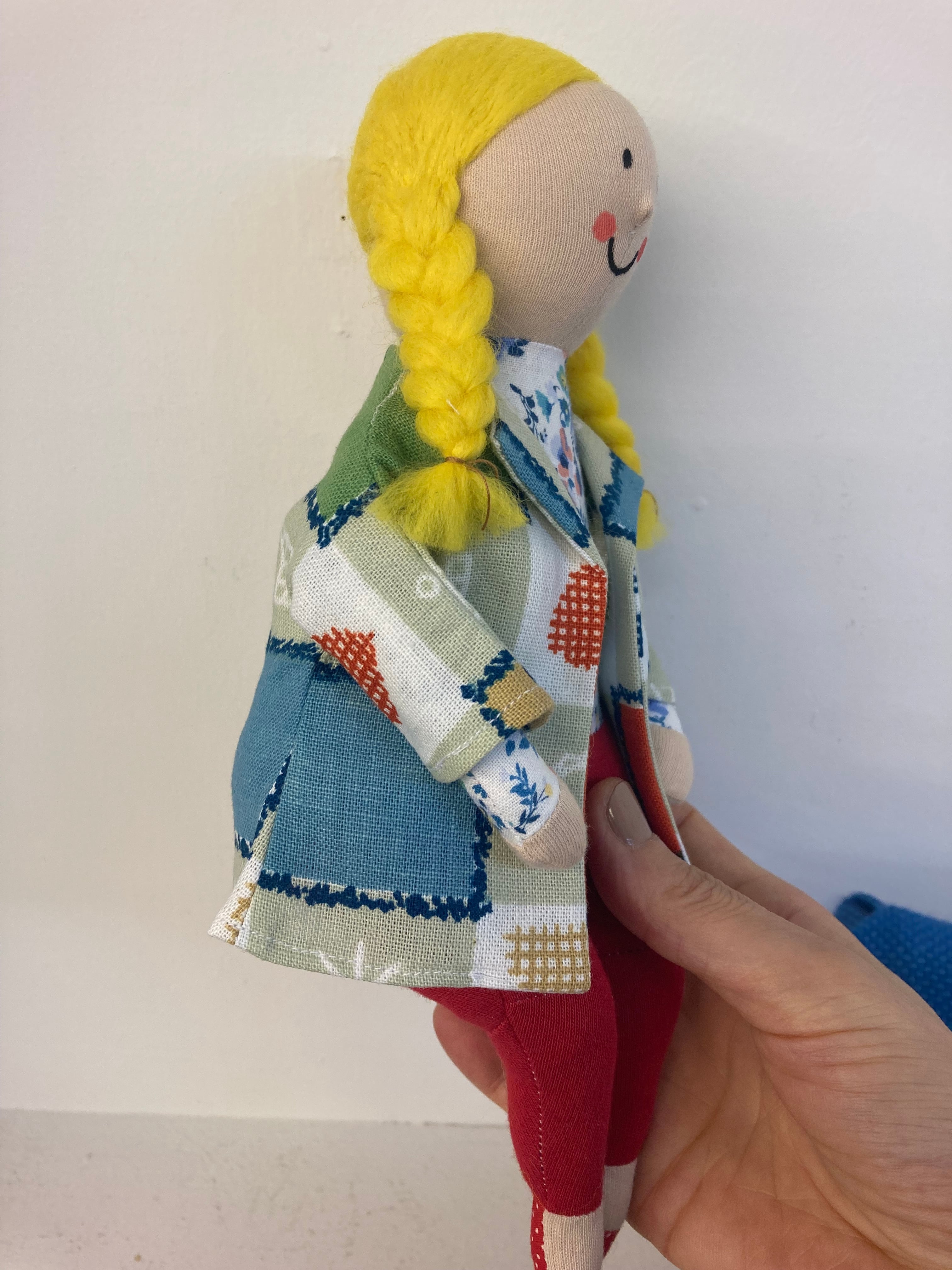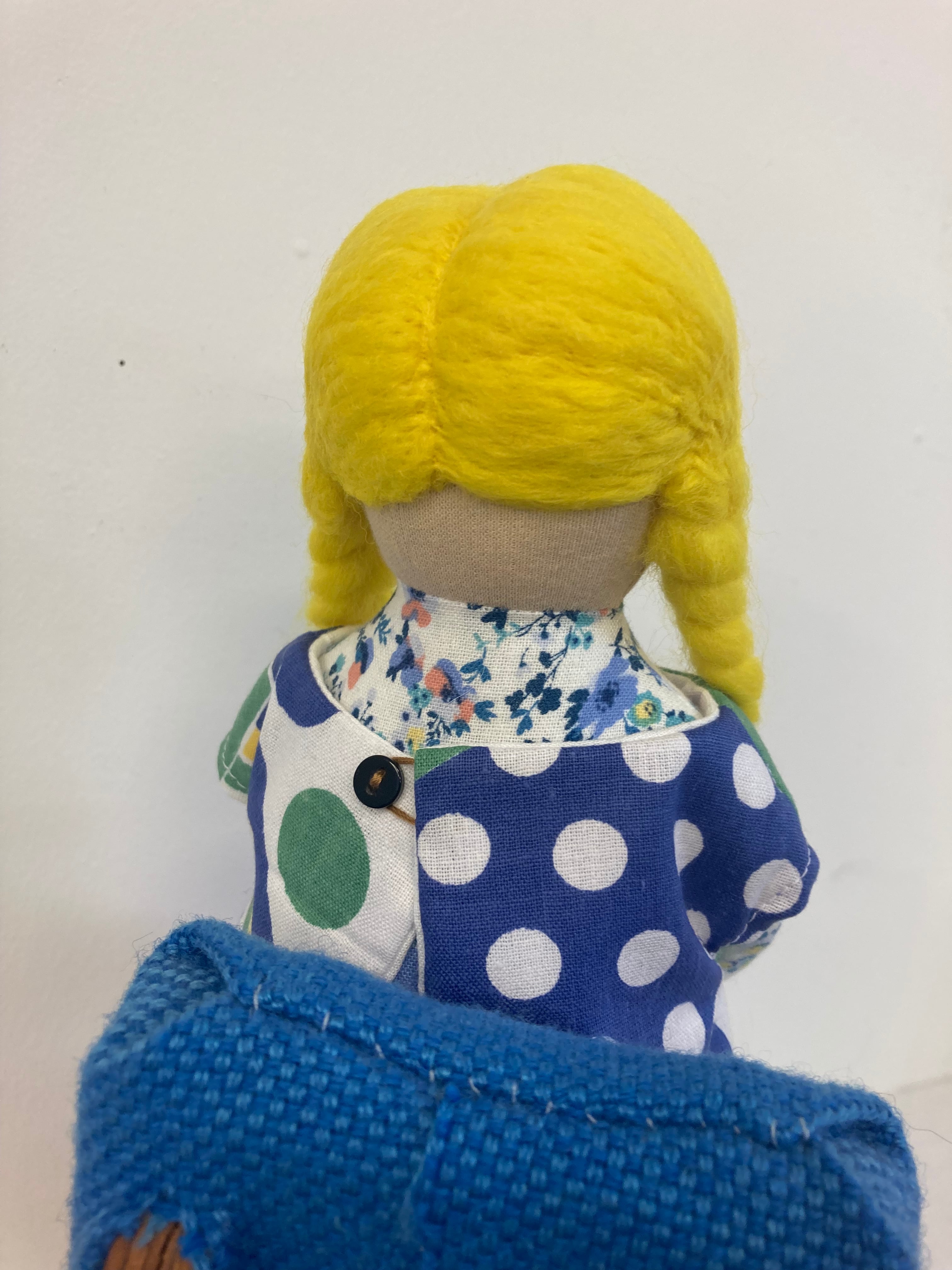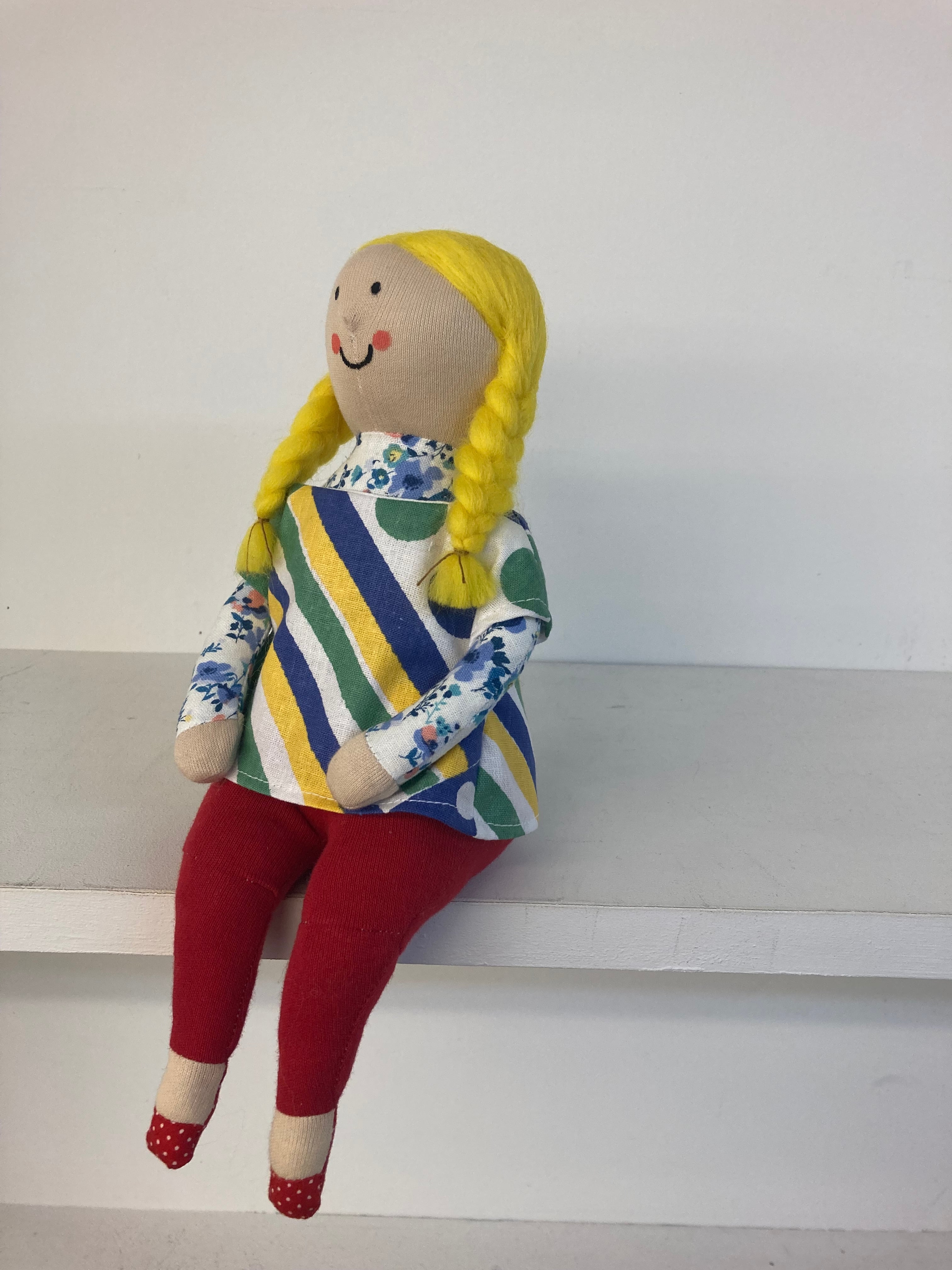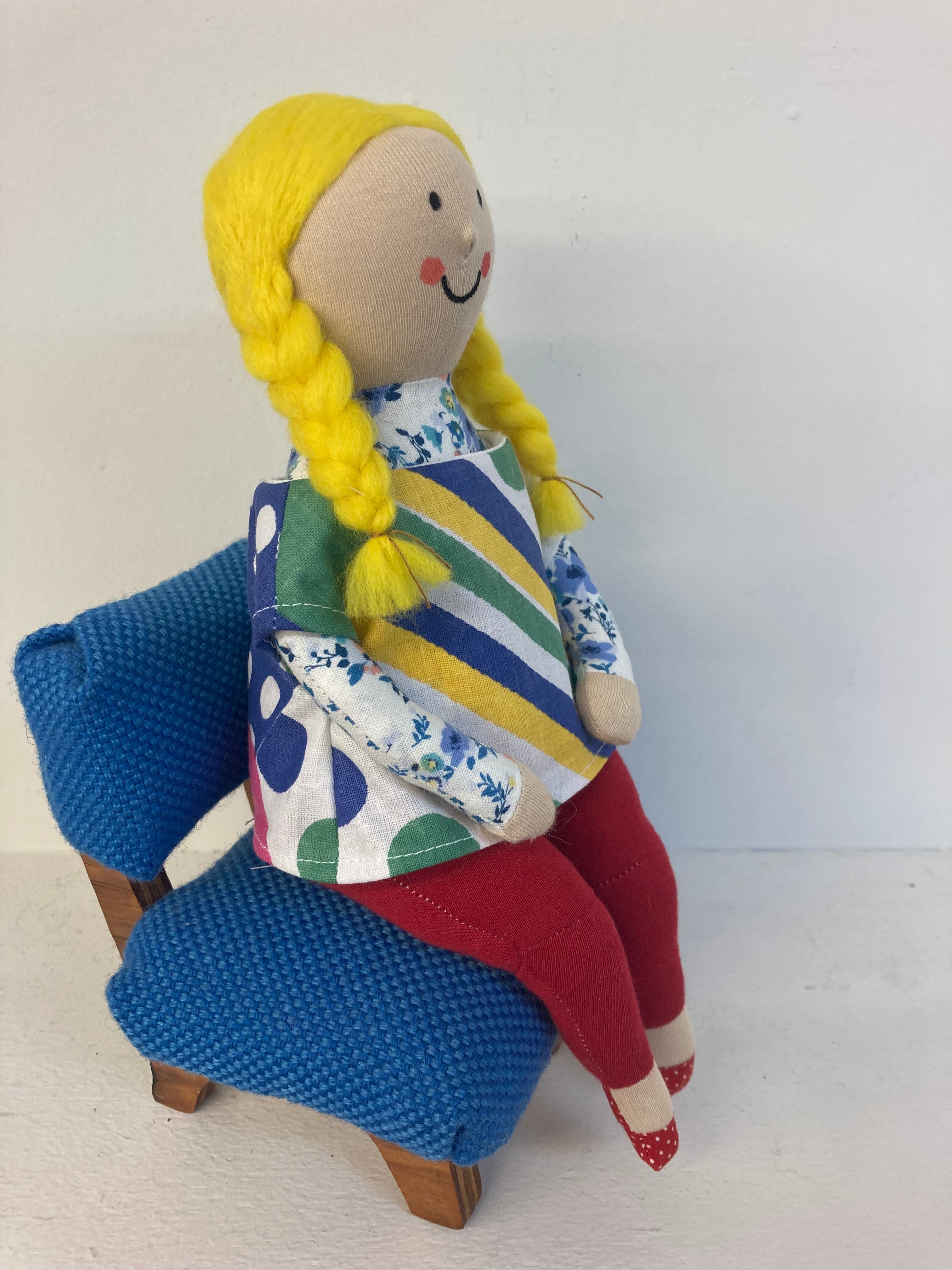 sokkoちゃん(ソッコちゃん) 座り姿 素材:コットンや麻の生地・アクリルわた・羊毛フェルト・ペレット・アクリル絵の具 身長:髪型も含めて27cmほど 肌の色:ベージュ 髪の色:黄色 チュニックのみ着せ替えができます。 棚や椅子・テーブルの上で自立して座ります。 (座面内部に重しとしてペレットを使用しています) ※椅子は付属しません ※着せ替え用のドレスは付属しません。 hand made by comatsumariko