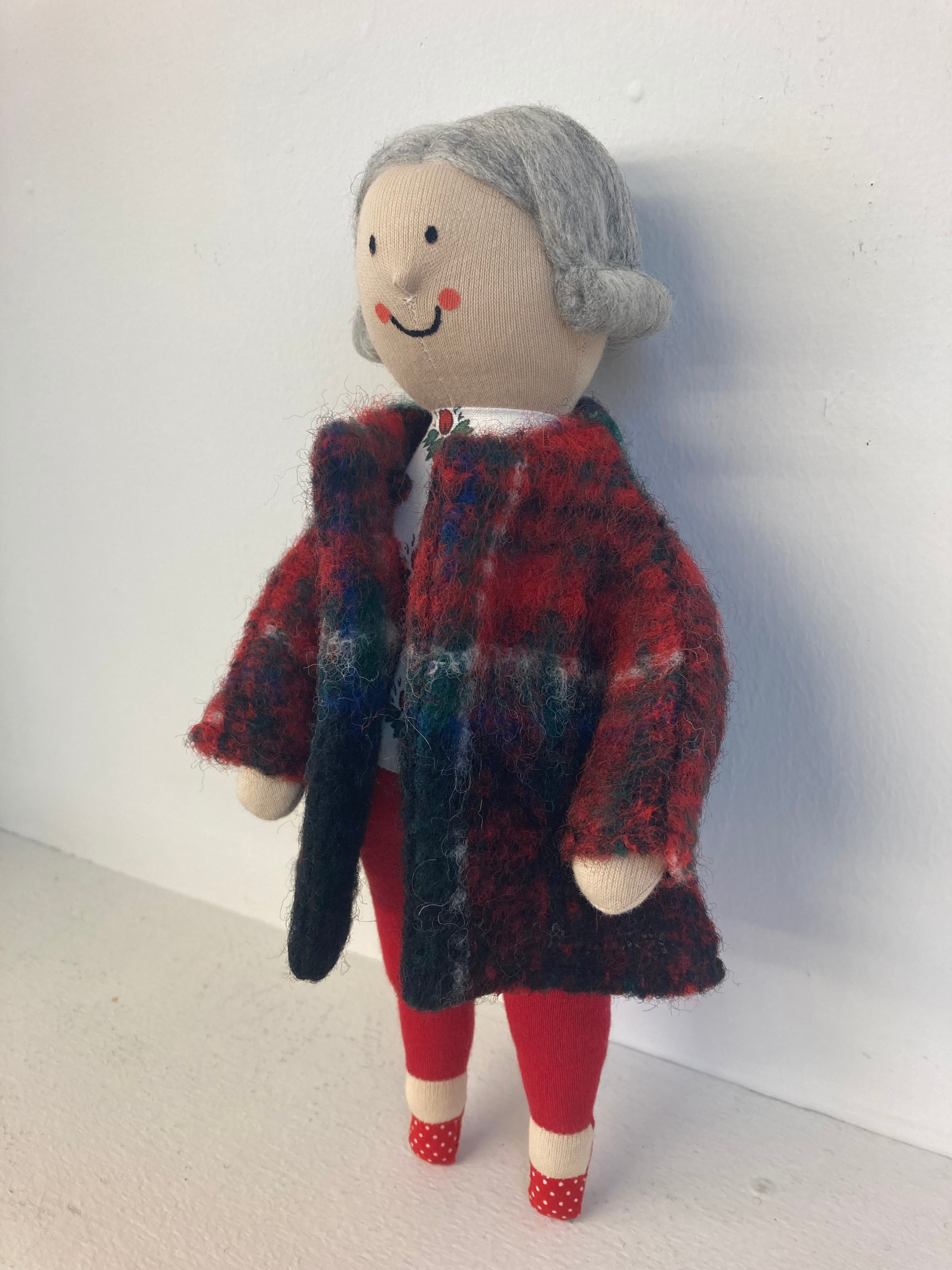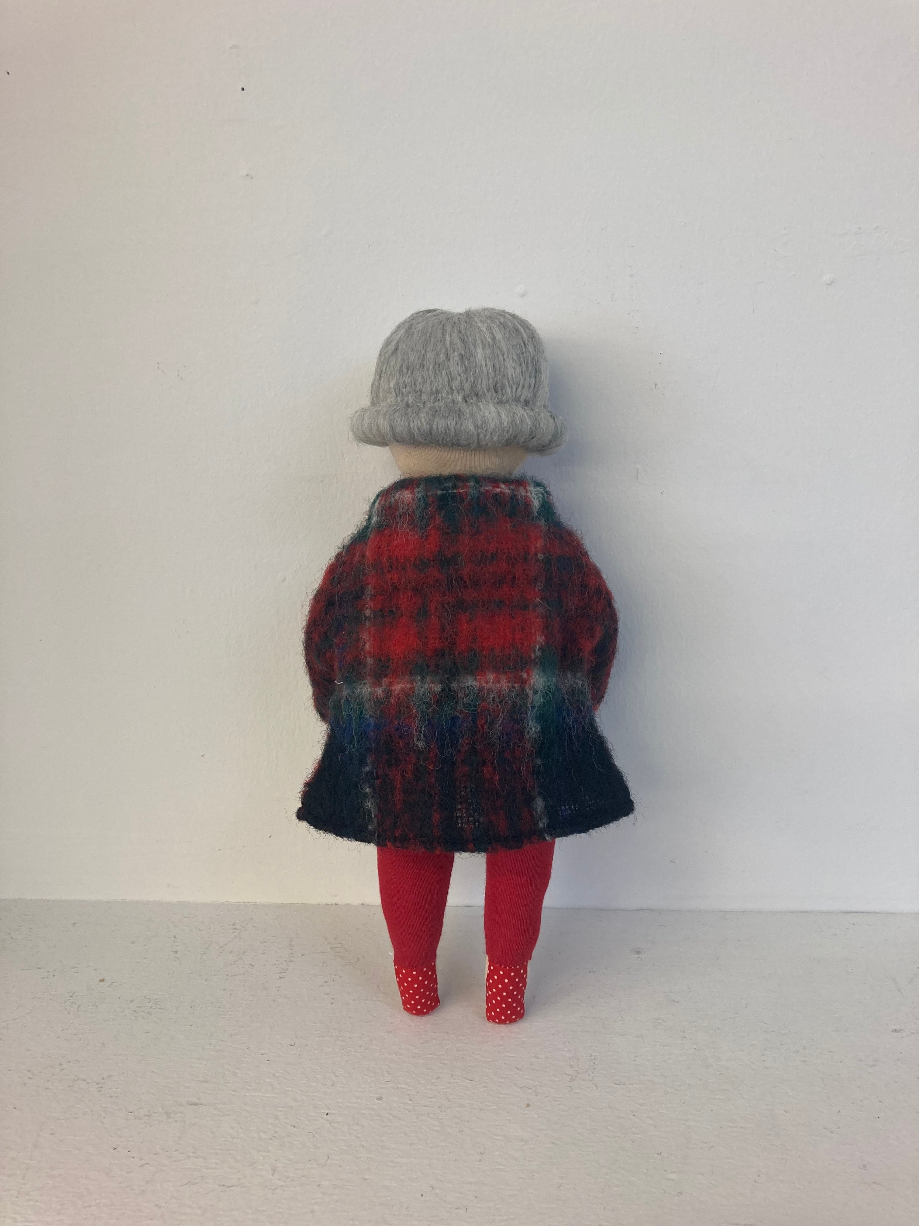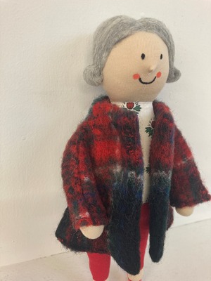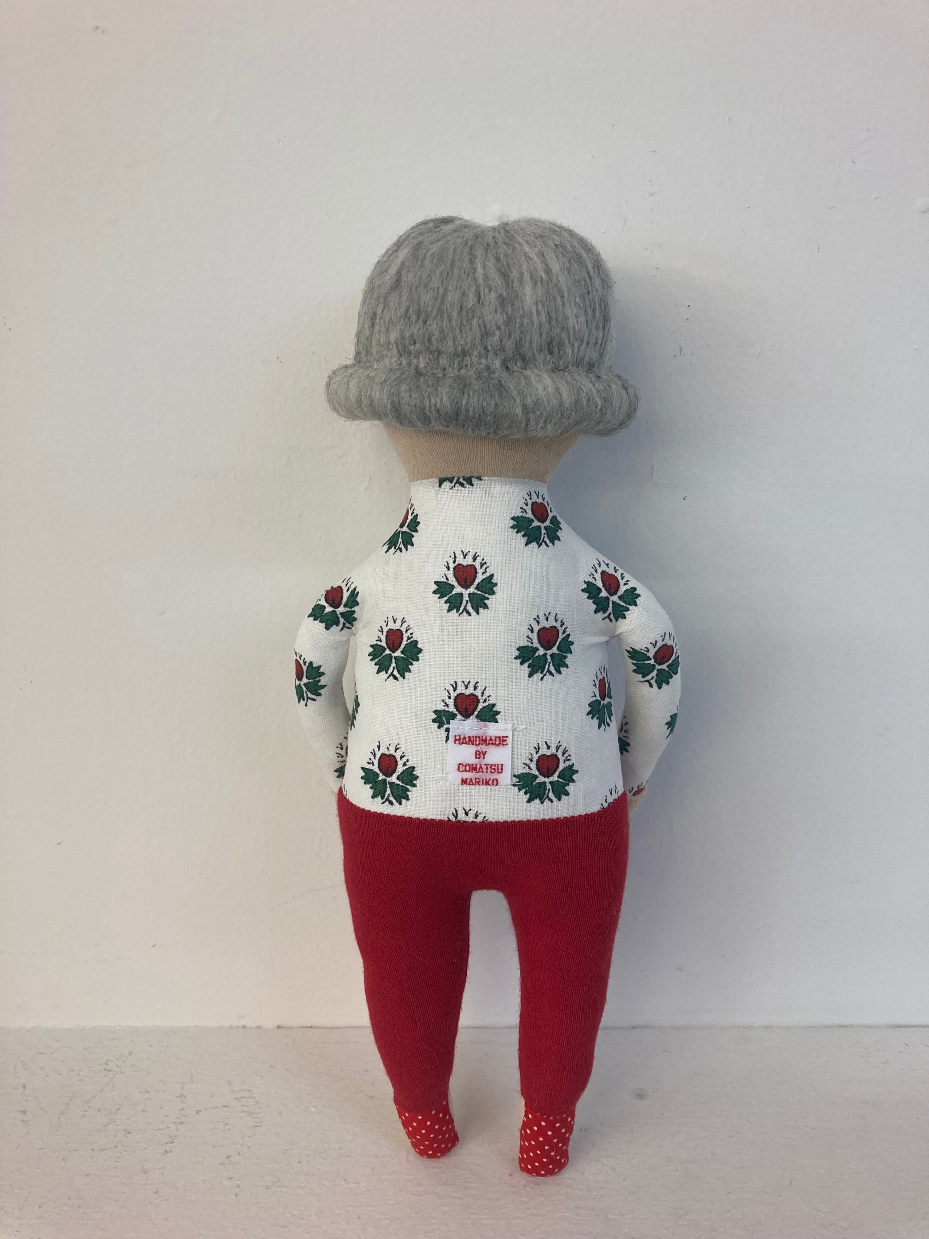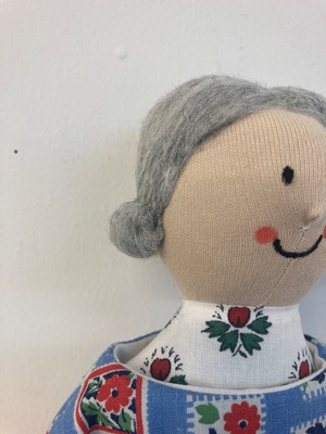 sokkoちゃん(ソッコちゃん) 立ち姿 素材:コットンや麻の生地・アクリルわた・羊毛フェルト・アクリル絵の具 身長:髪型も含めて27cmほど 肌の色:ベージュ色 髪の色:灰色 チュニックのみ着せ替えができます。 自立して立つ事は出来ませんので、本棚や壁などにに立てかけて飾って下さい。 お洋服にアメリカやヨーロッパのヴィンテージ布を使用しています。 着せ替え用のドレスは付属しません。