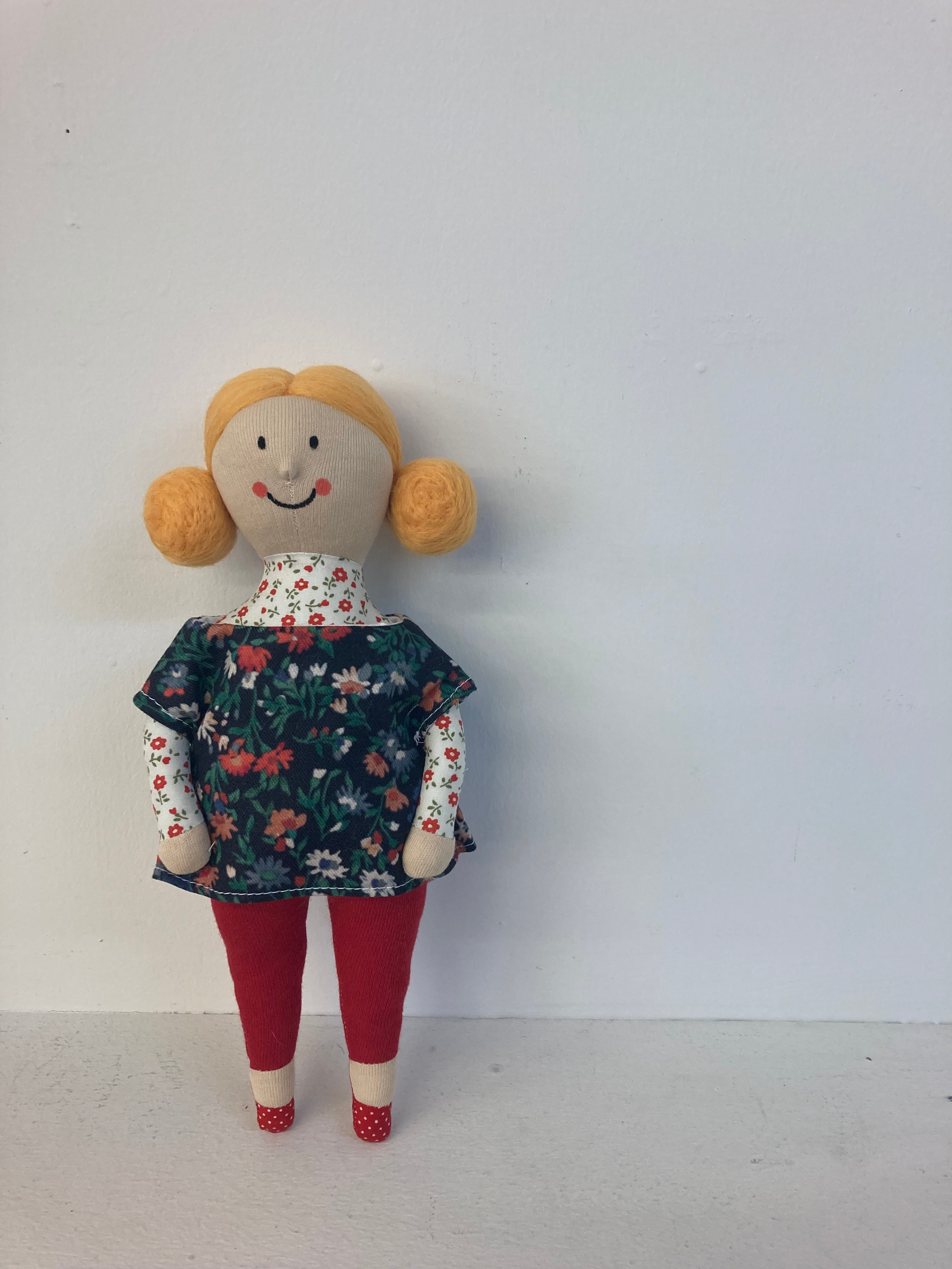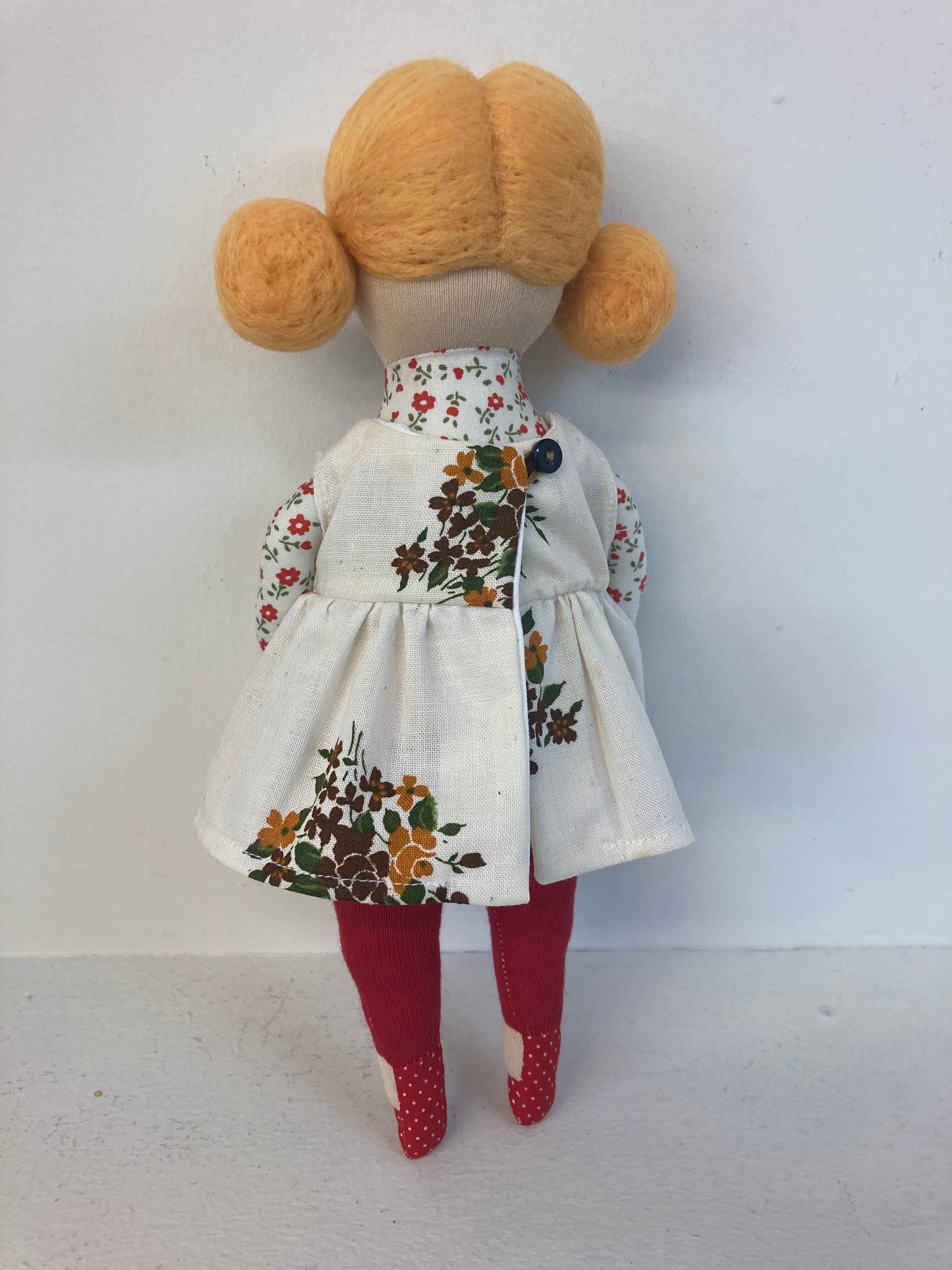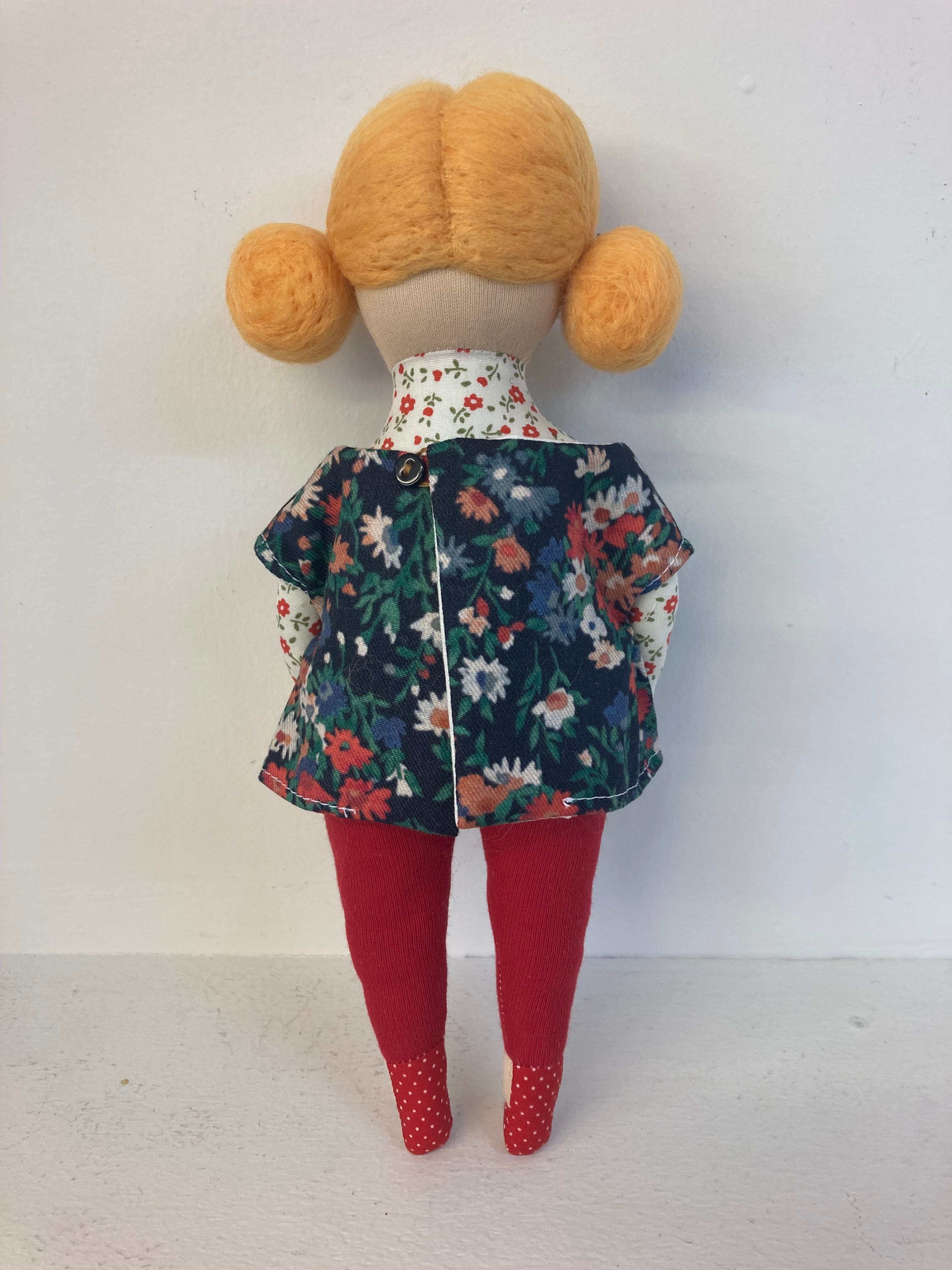 sokkoちゃん(ソッコちゃん) 立ち姿 素材:コットンや麻の生地・アクリルわた・羊毛フェルト・アクリル絵の具 身長:髪型も含めて27cmほど 肌の色:ベージュ色 髪の色:だいだい色 チュニックのみ着せ替えが出来ます。 自立して立つ事は出来ませんので、本棚や壁などにに立てかけて飾って下さい。 お洋服にアメリカやヨーロッパのヴィンテージ布を使用しています。 着せ替え用のドレスは付属しません。
