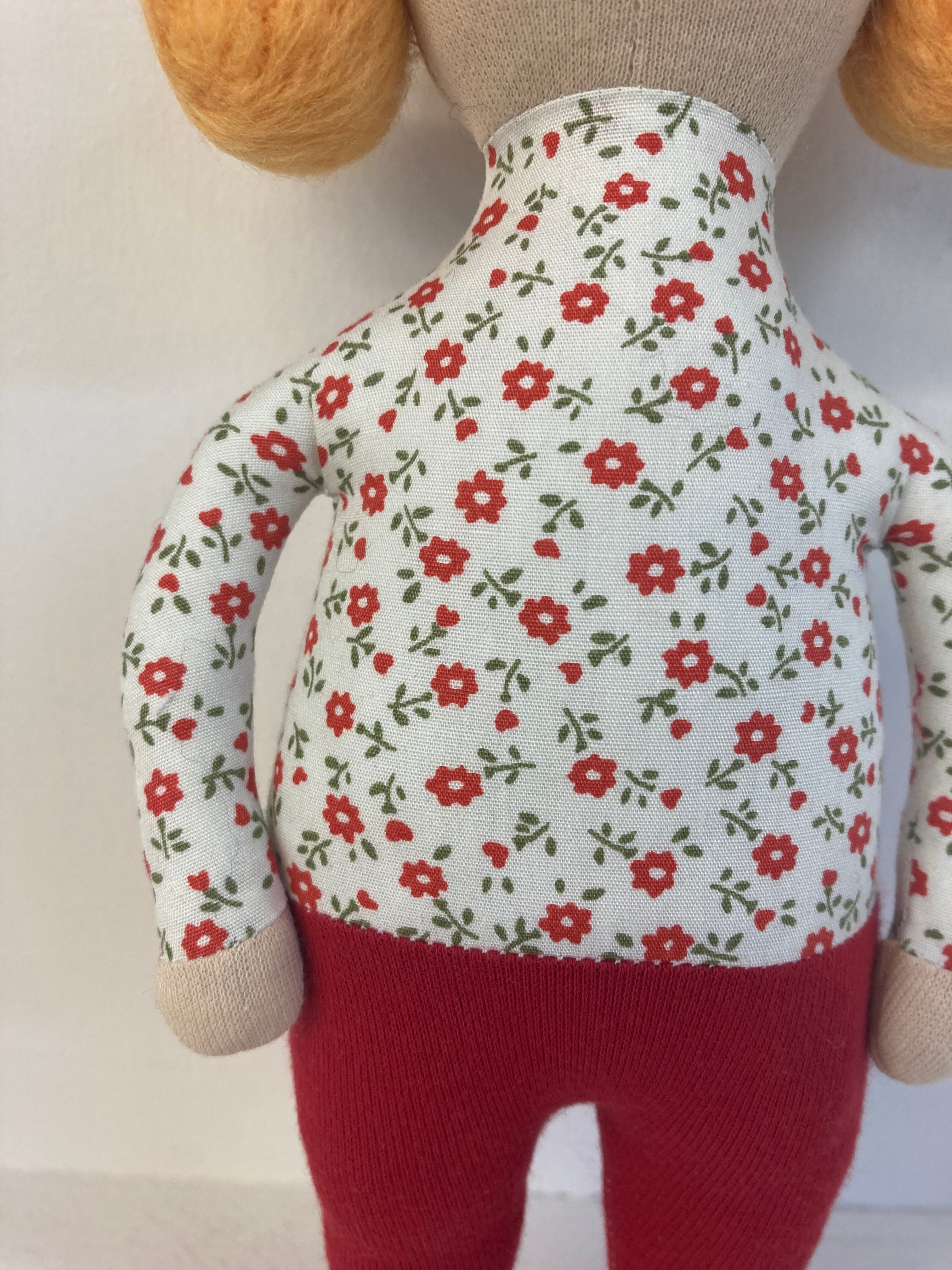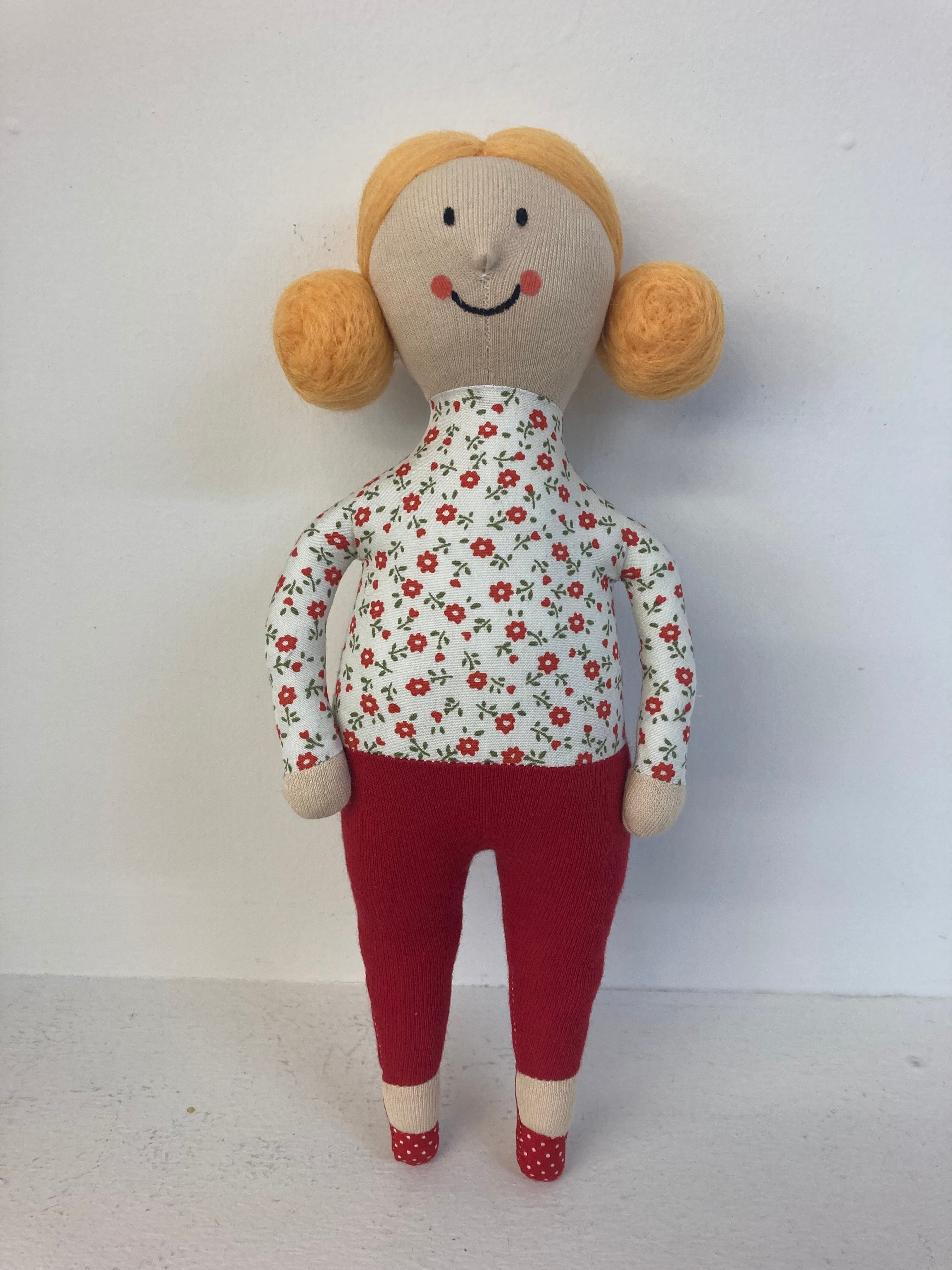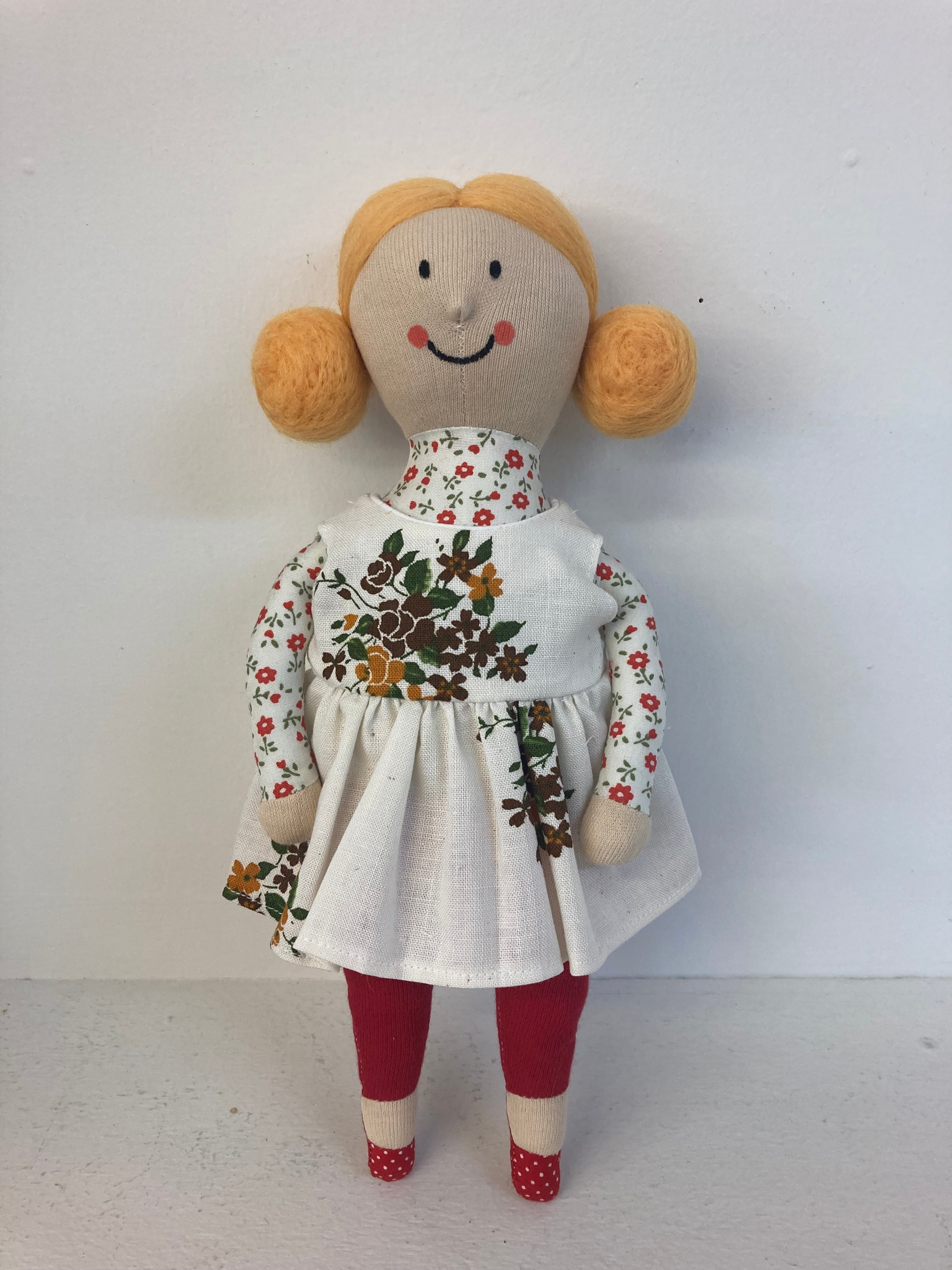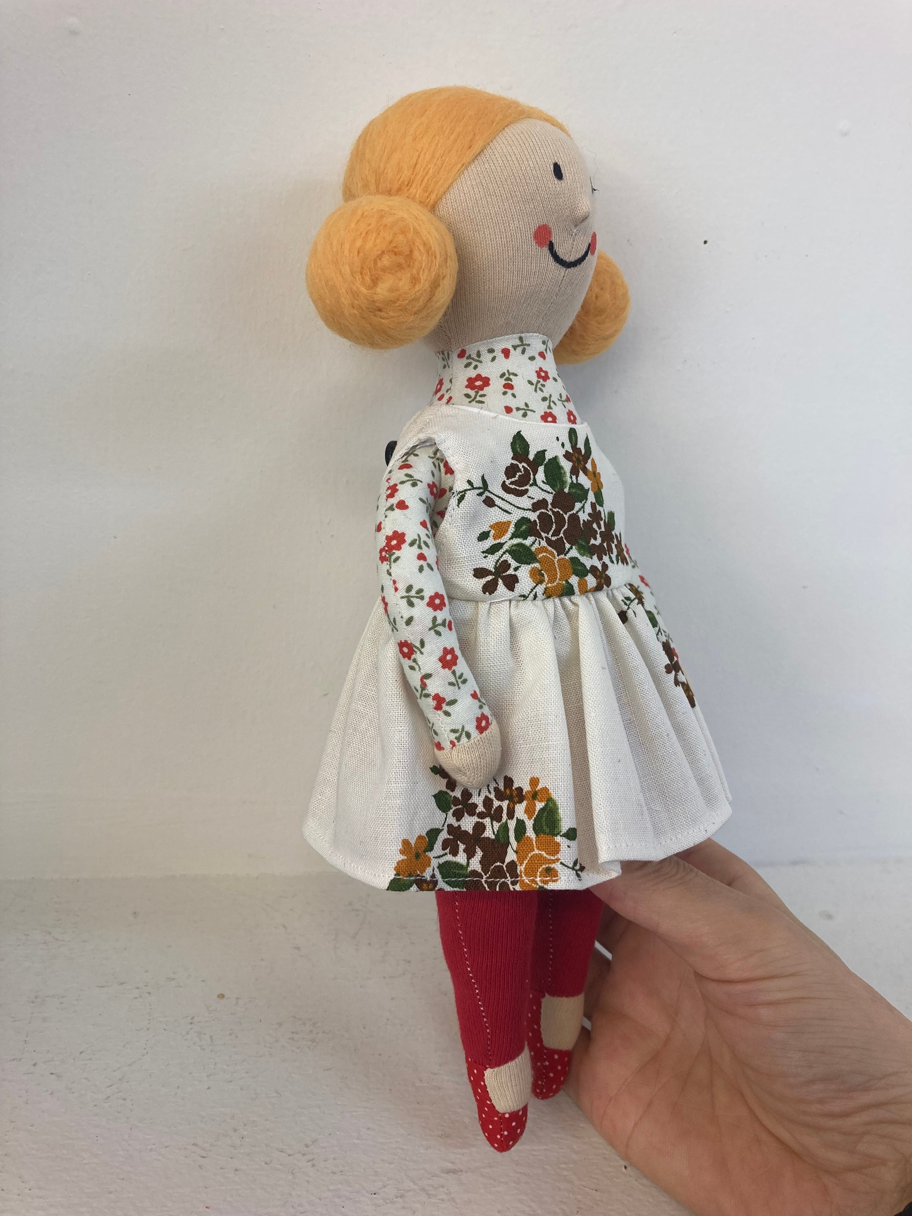 sokkoちゃん(ソッコちゃん) 立ち姿 素材:コットンや麻の生地・アクリルわた・羊毛フェルト・アクリル絵の具 身長:髪型も含めて27cmほど 肌の色:ベージュ色 髪の色:だいだい色 チュニックのみ着せ替えが出来ます。 自立して立つ事は出来ませんので、本棚や壁などにに立てかけて飾って下さい。 お洋服にアメリカやヨーロッパのヴィンテージ布を使用しています。 着せ替え用のドレスは付属しません。