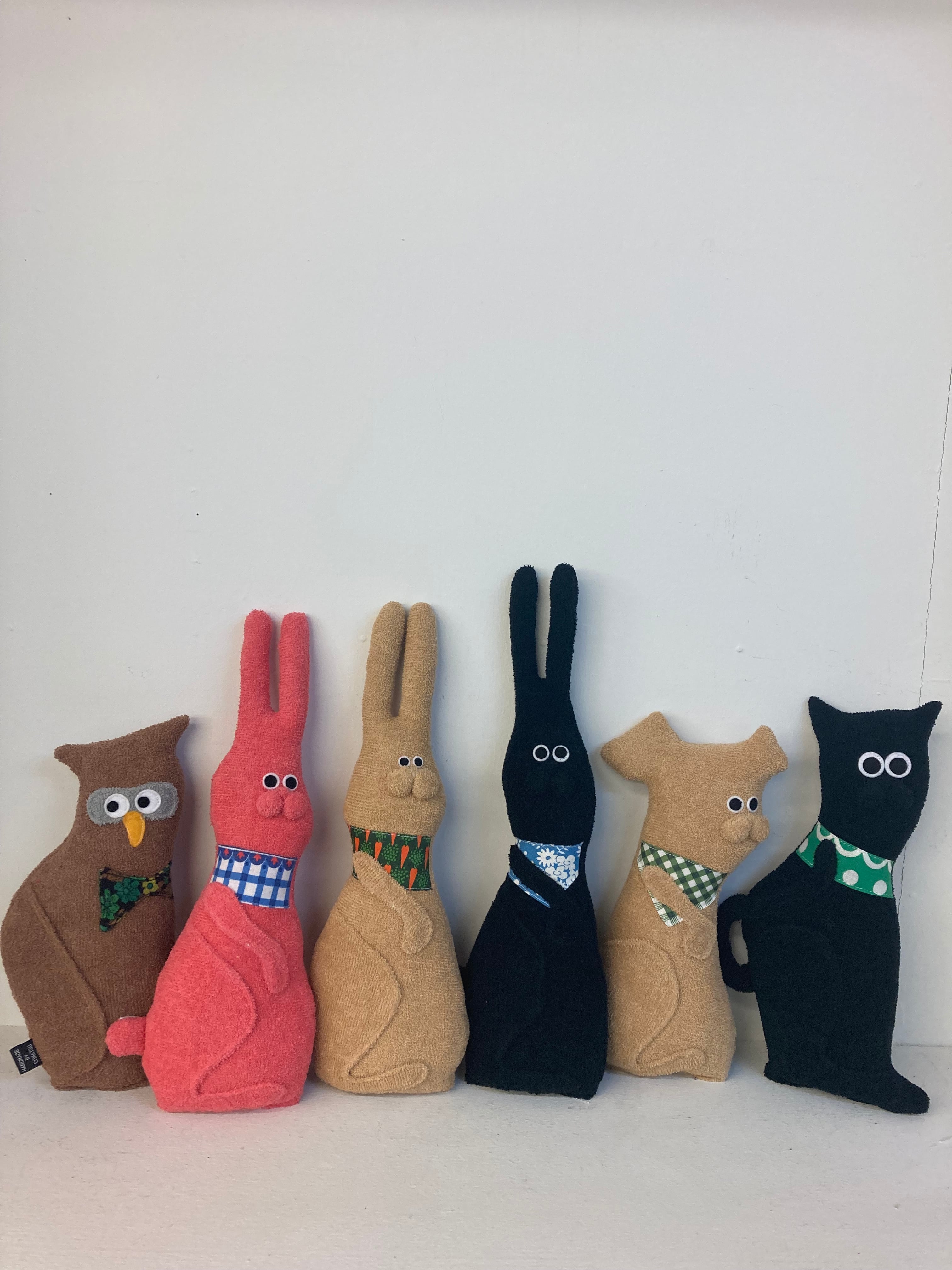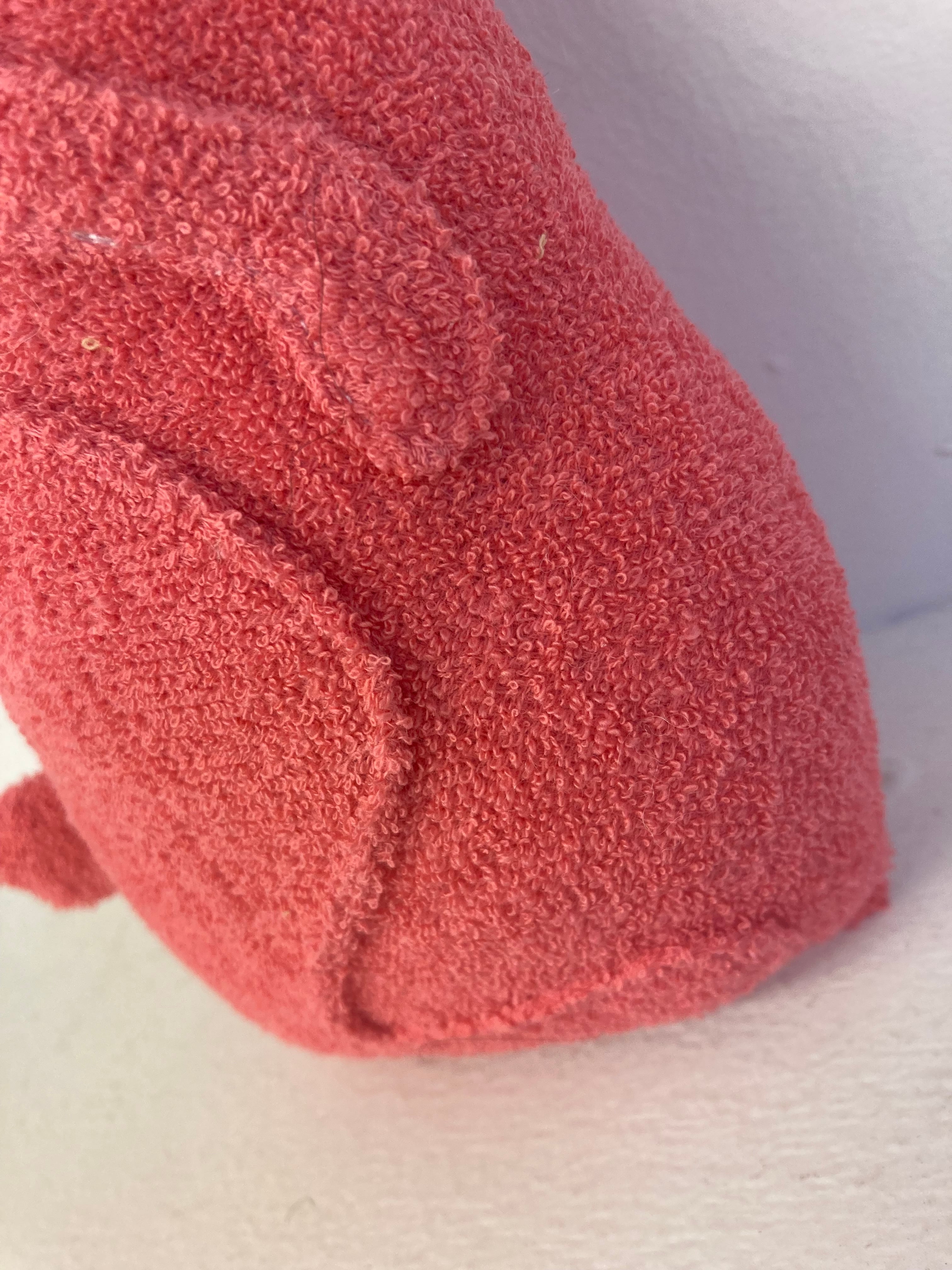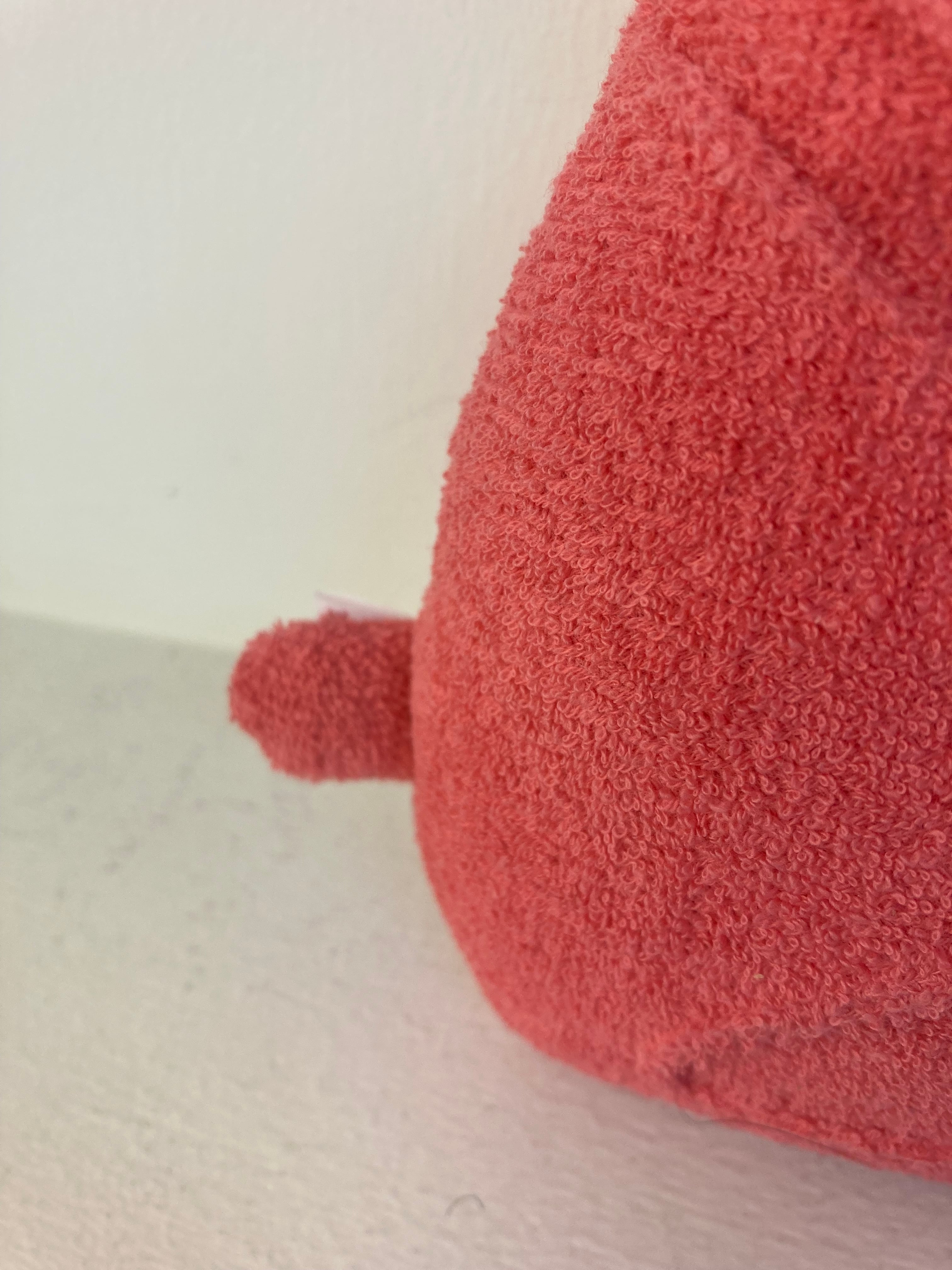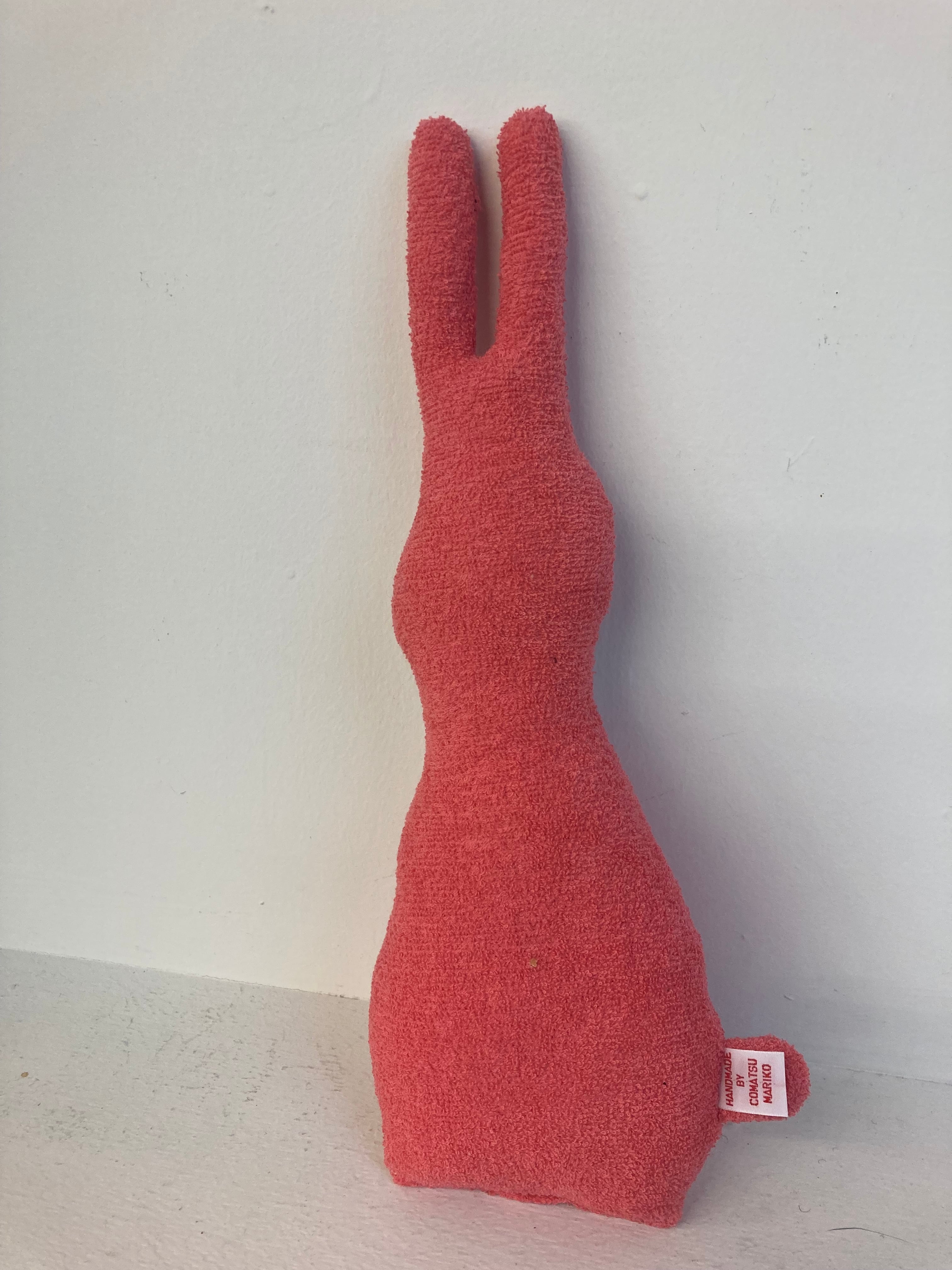 うさぎのカニーンさん 素材:コットンパイル生地・アクリルわた・フェルト 身長:29cmほど(自立はしません) 色 :ピンク色 黒目の大きさ:7mm ※ネットに入れてお洗濯可能です。 その際にはしっかりと乾かして下さい。 色の濃い生地は色落ちの可能性がございますので単体で洗って頂く事をお勧めします。 hand made by comatsumariko