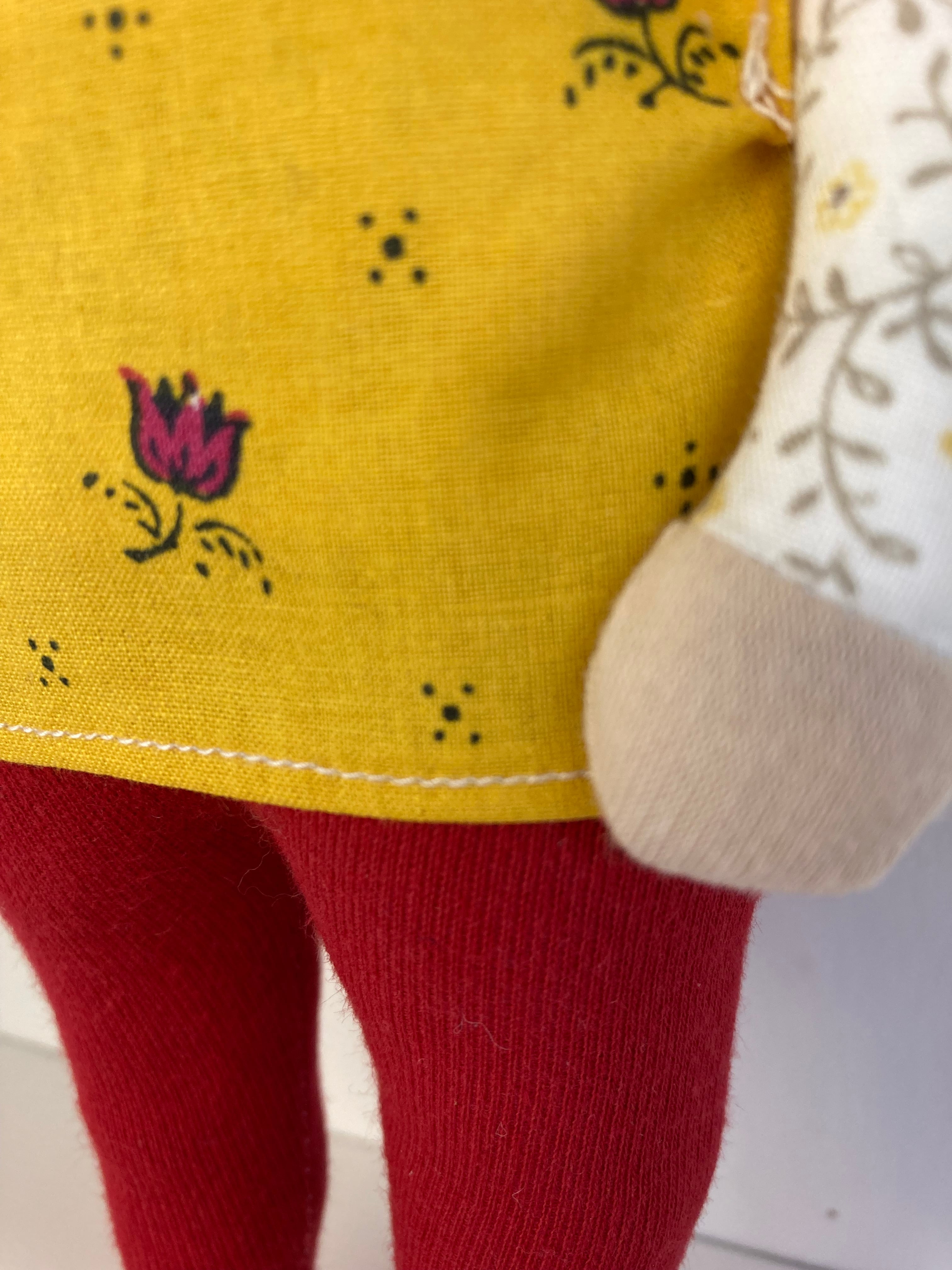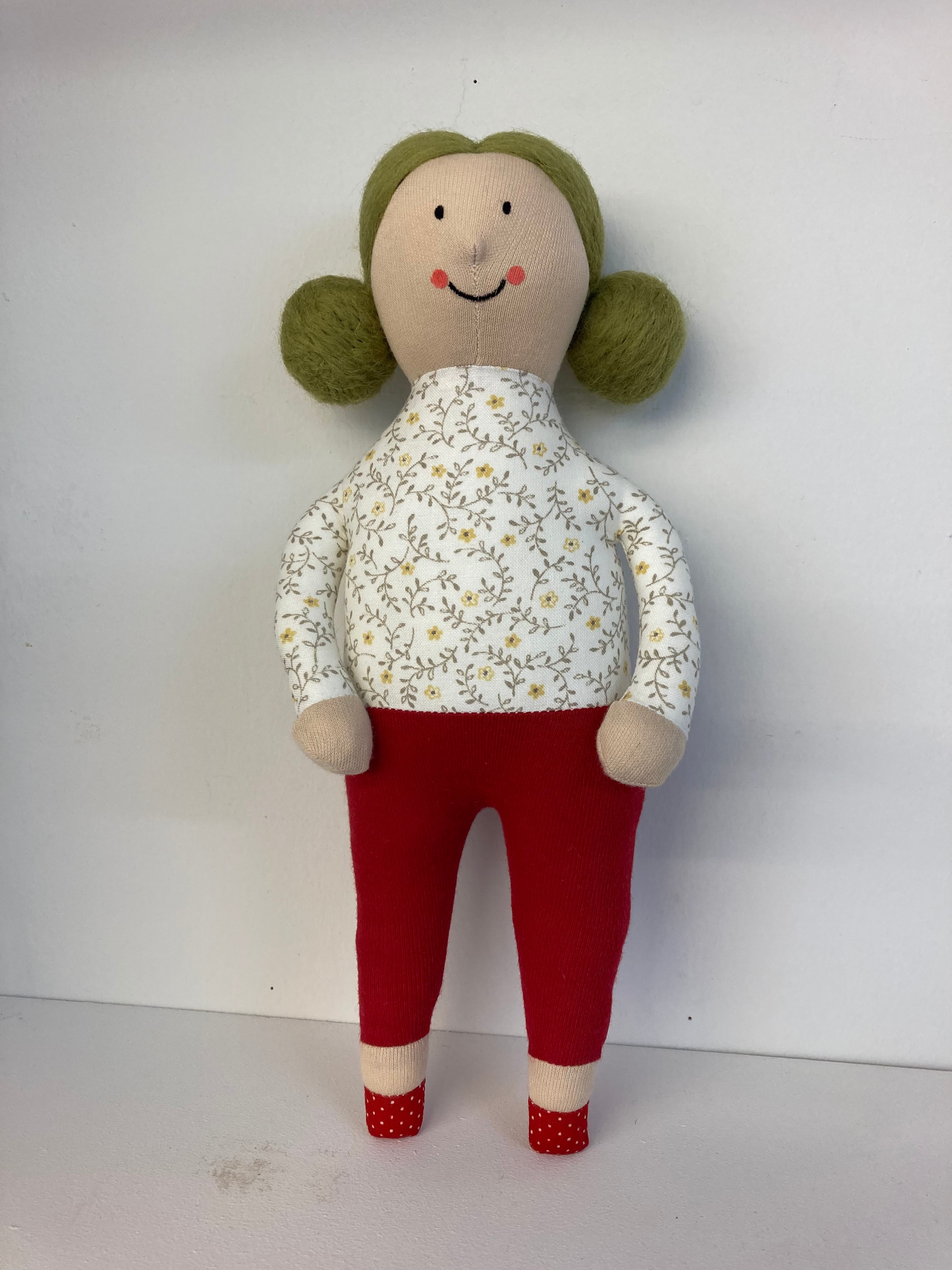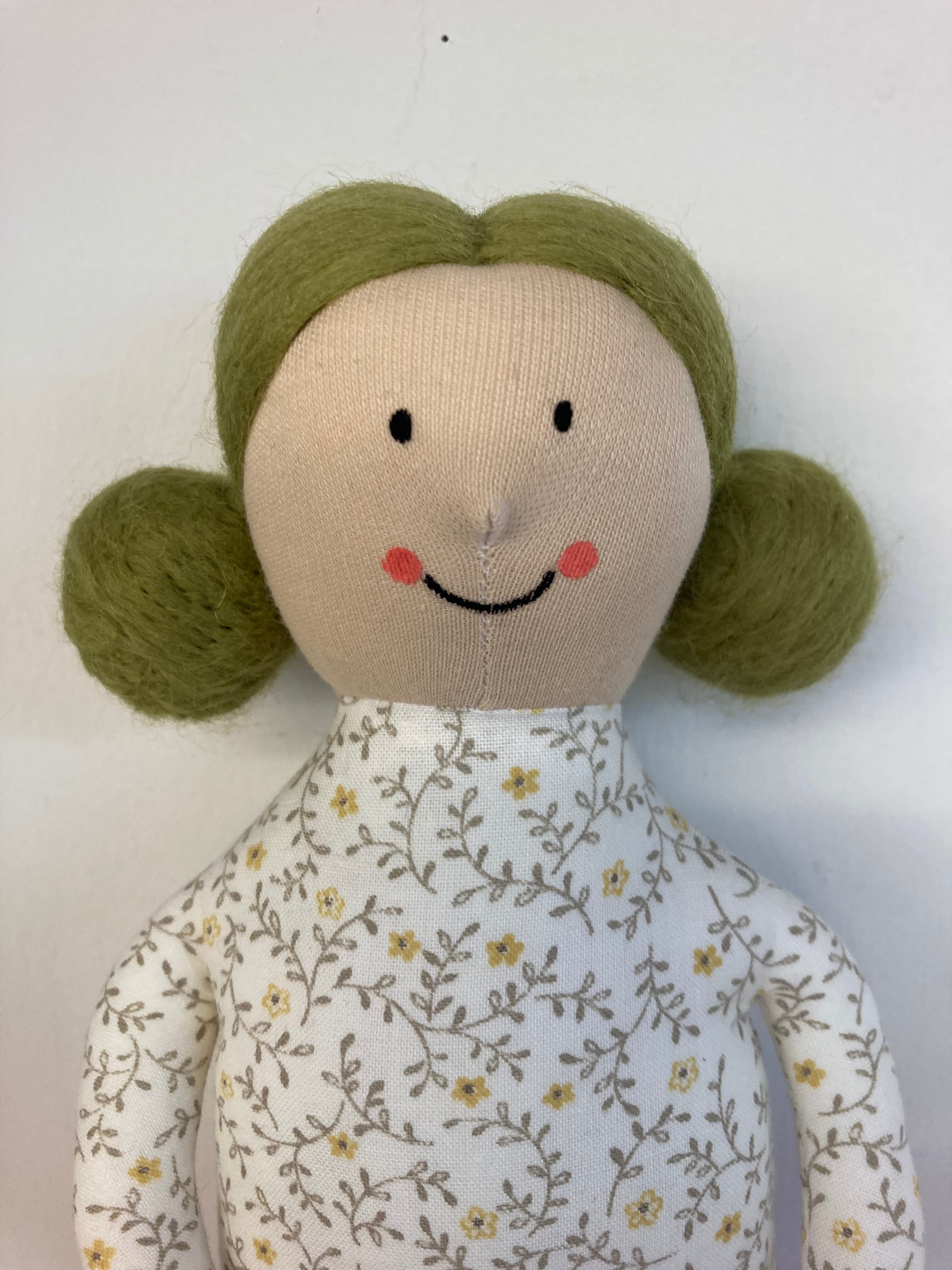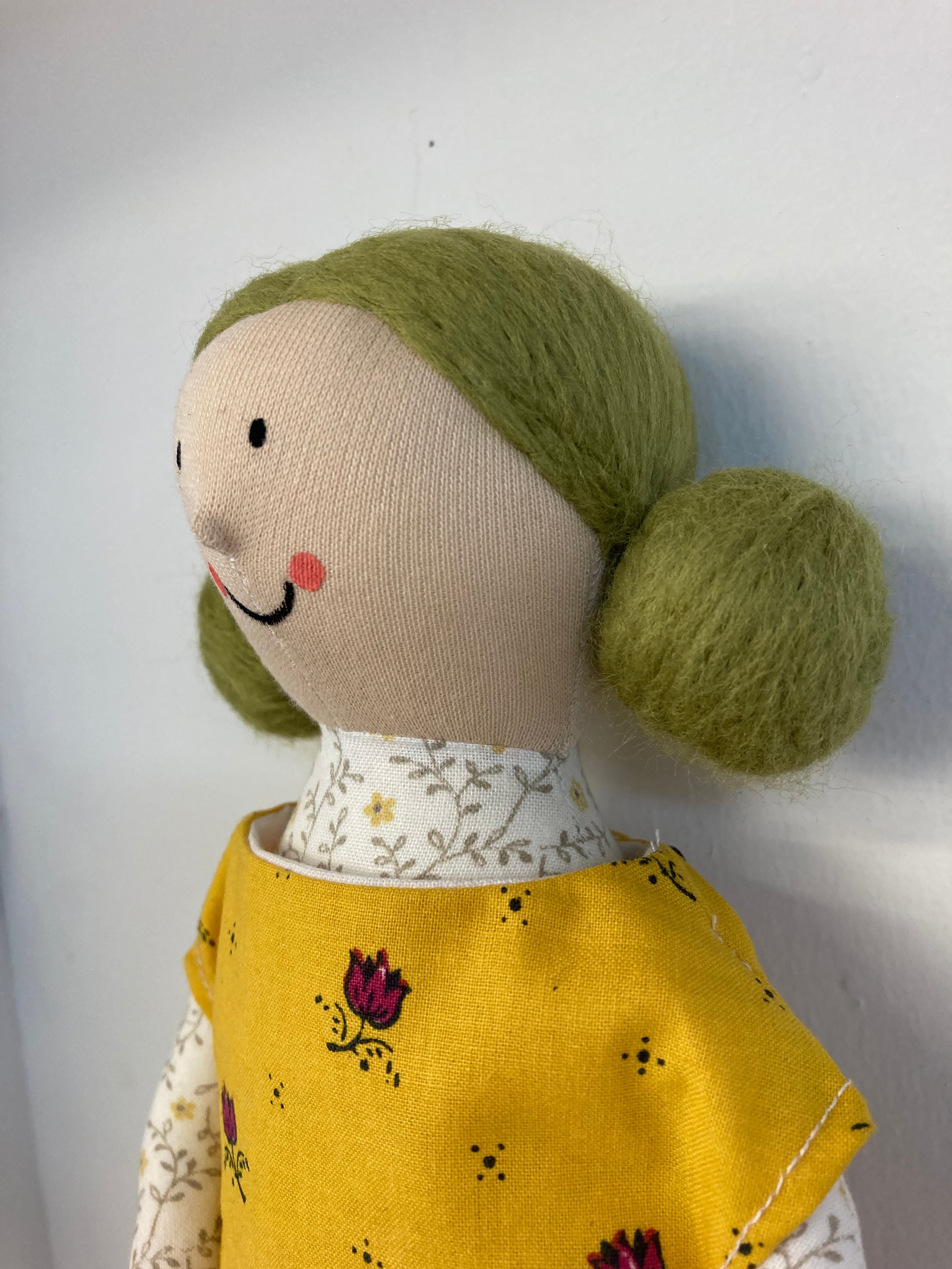 sokkoちゃん(ソッコちゃん) 立ち姿 素材:コットンや麻の生地・アクリルわた・羊毛フェルト・アクリル絵の具 身長:髪型も含めて27cmほど 肌の色:ベージュ色 髪の色:ウグイス色 チュニックのみ着せ替えが出来ます。 自立して立つ事は出来ませんので、本棚や壁などにに立てかけて飾って下さい。 お洋服にアメリカやヨーロッパのヴィンテージ布を使用しています。 着せ替え用のドレスは付属しません。