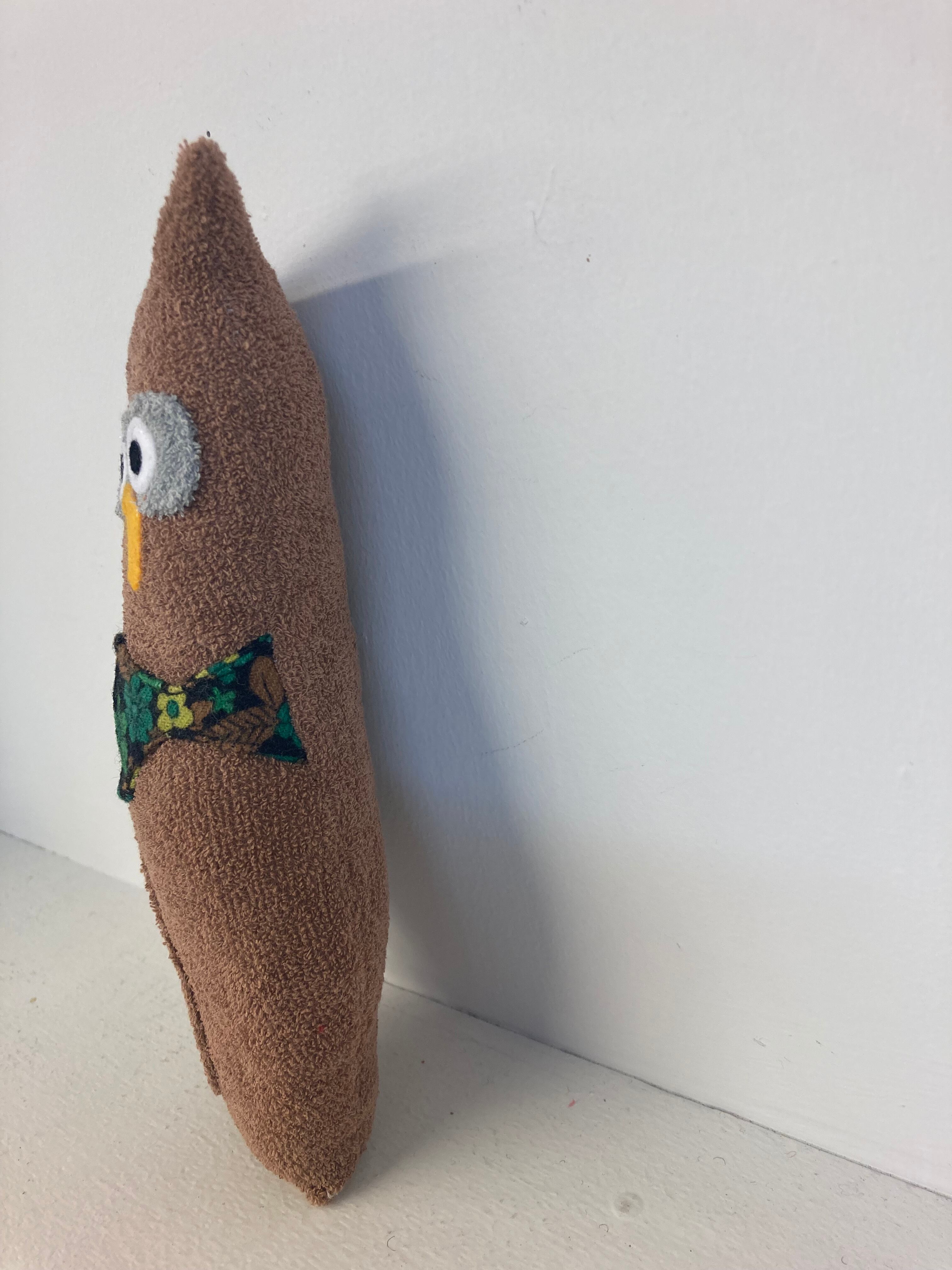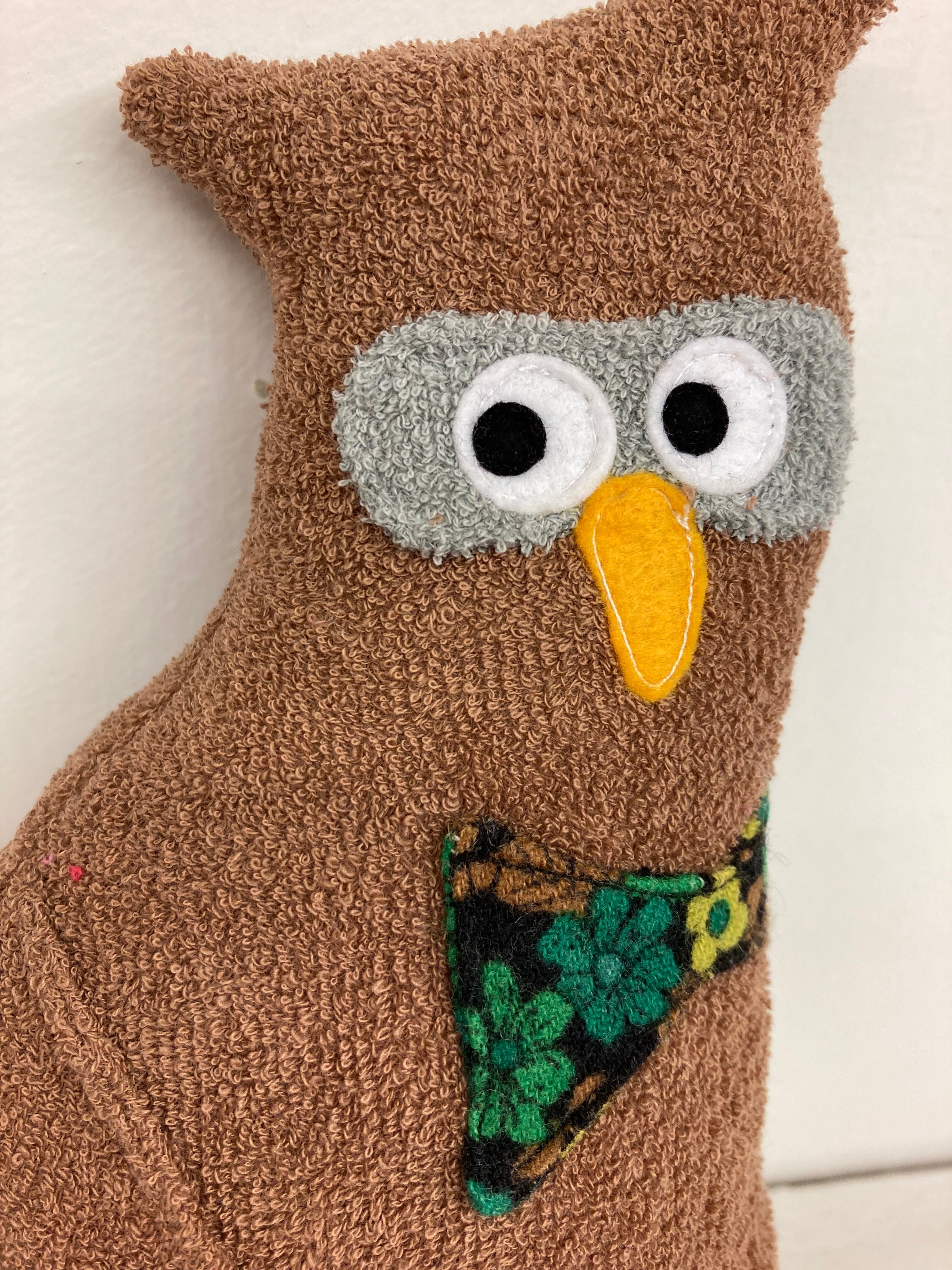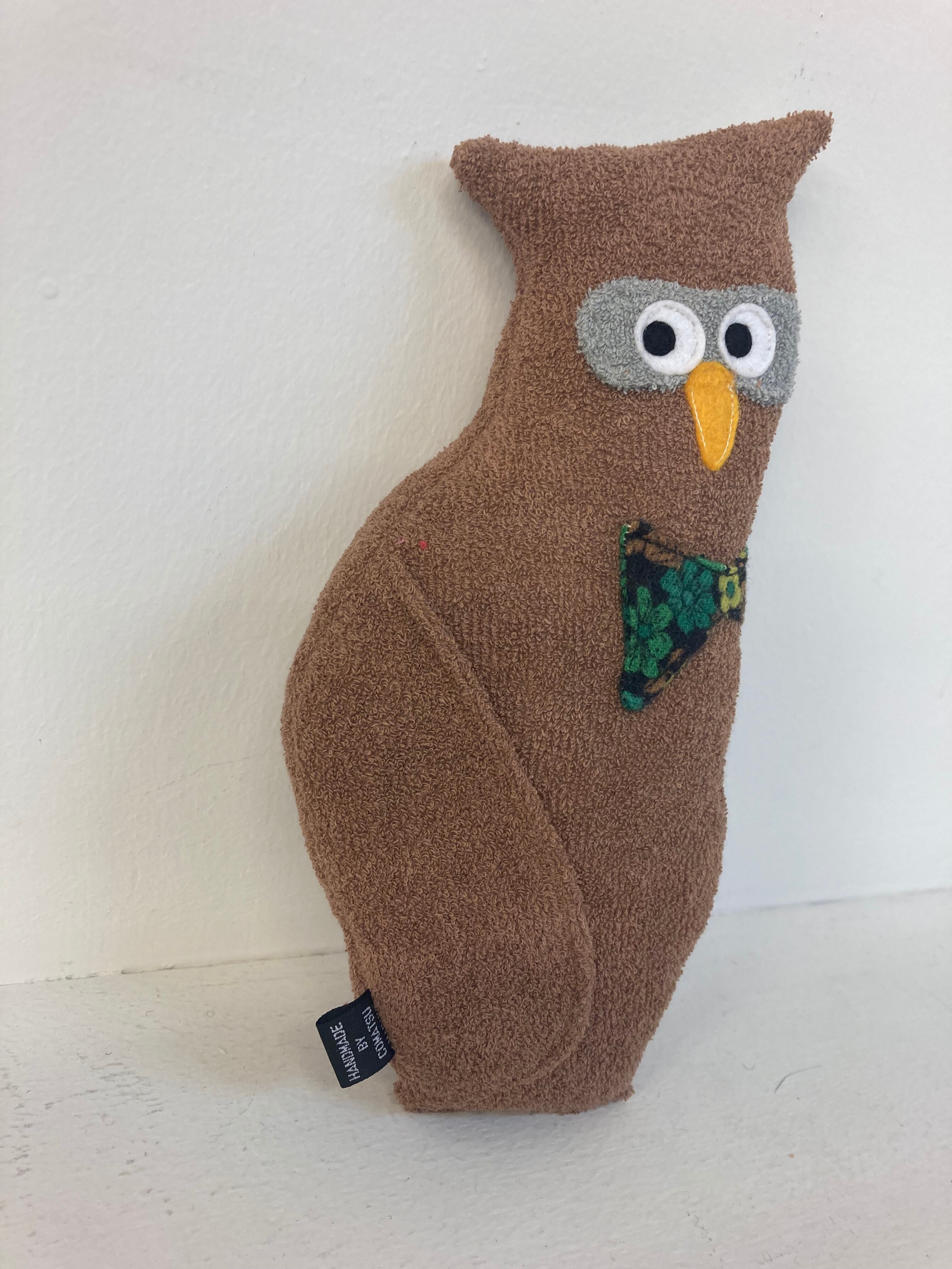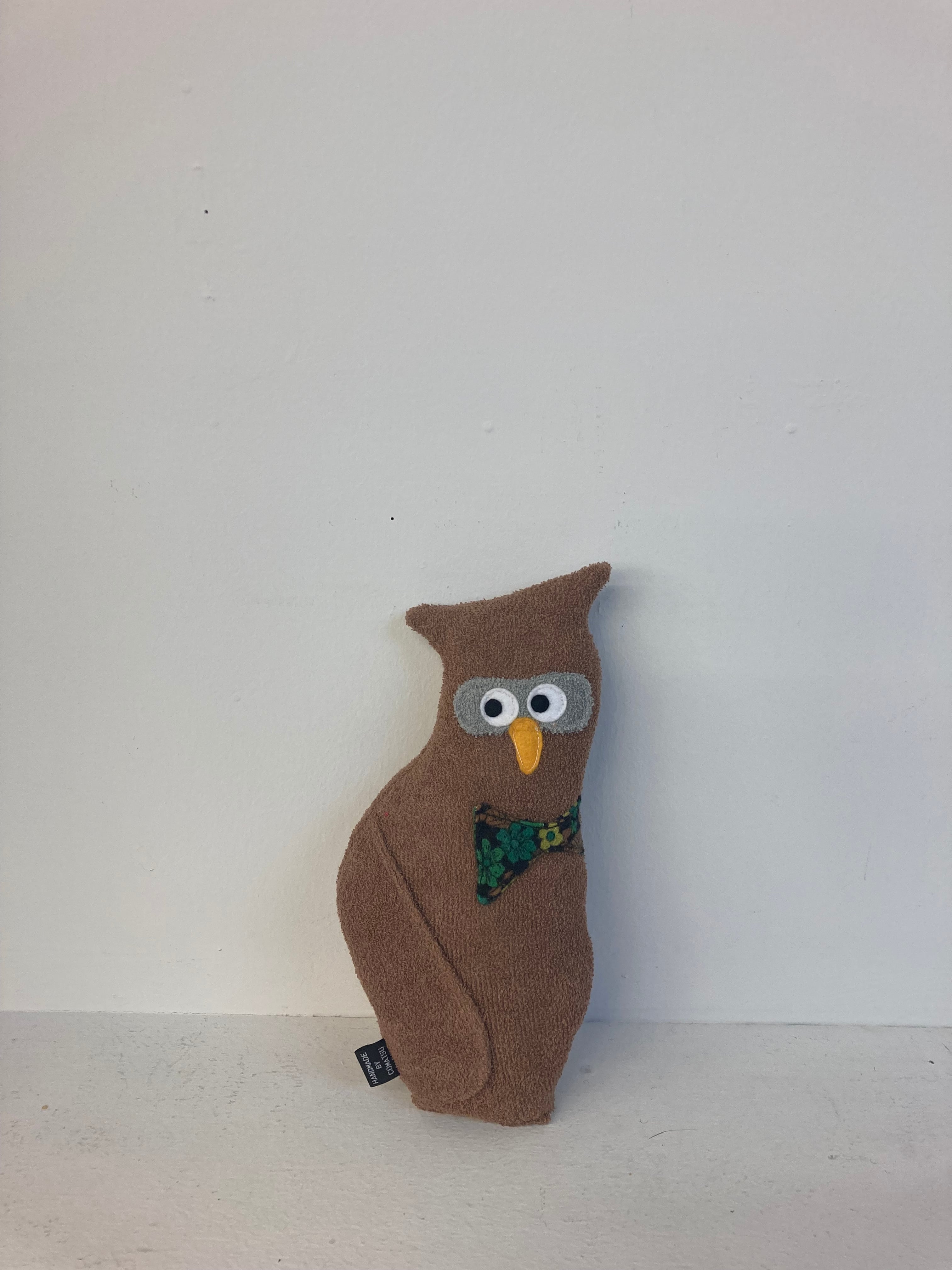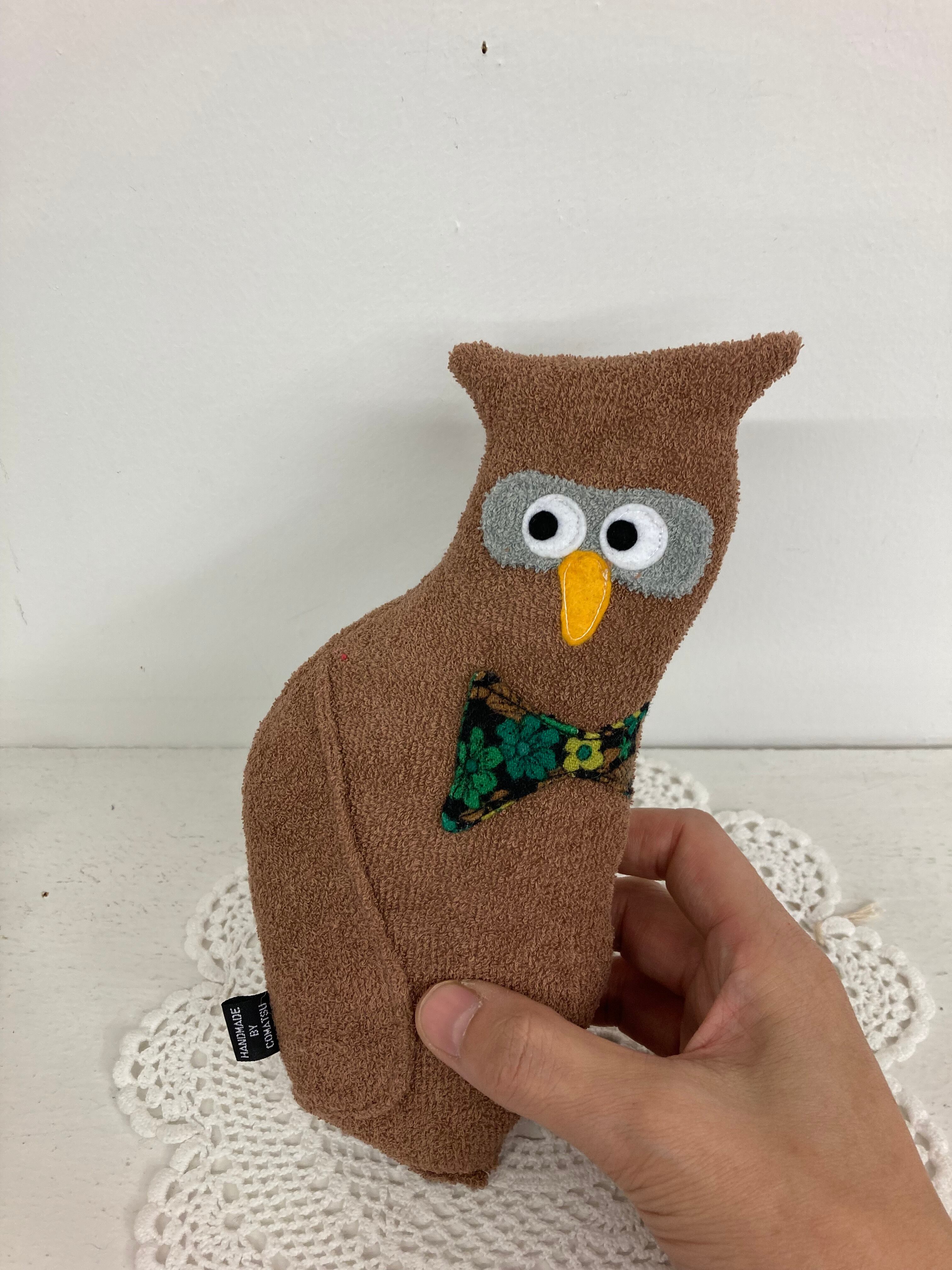ふくろうのオウルさん 素材:コットンパイル生地・アクリルわた・フェルト 身長:22cmほど(自立はしません) 色 :薄い茶色 黒目の大きさ:7mm ※ネットに入れてお洗濯可能です。 その際にはしっかりと乾かして下さい。 色の濃い生地は色落ちの可能性がございますので単体で洗って頂く事をお勧めします。 hand made by comatsumariko